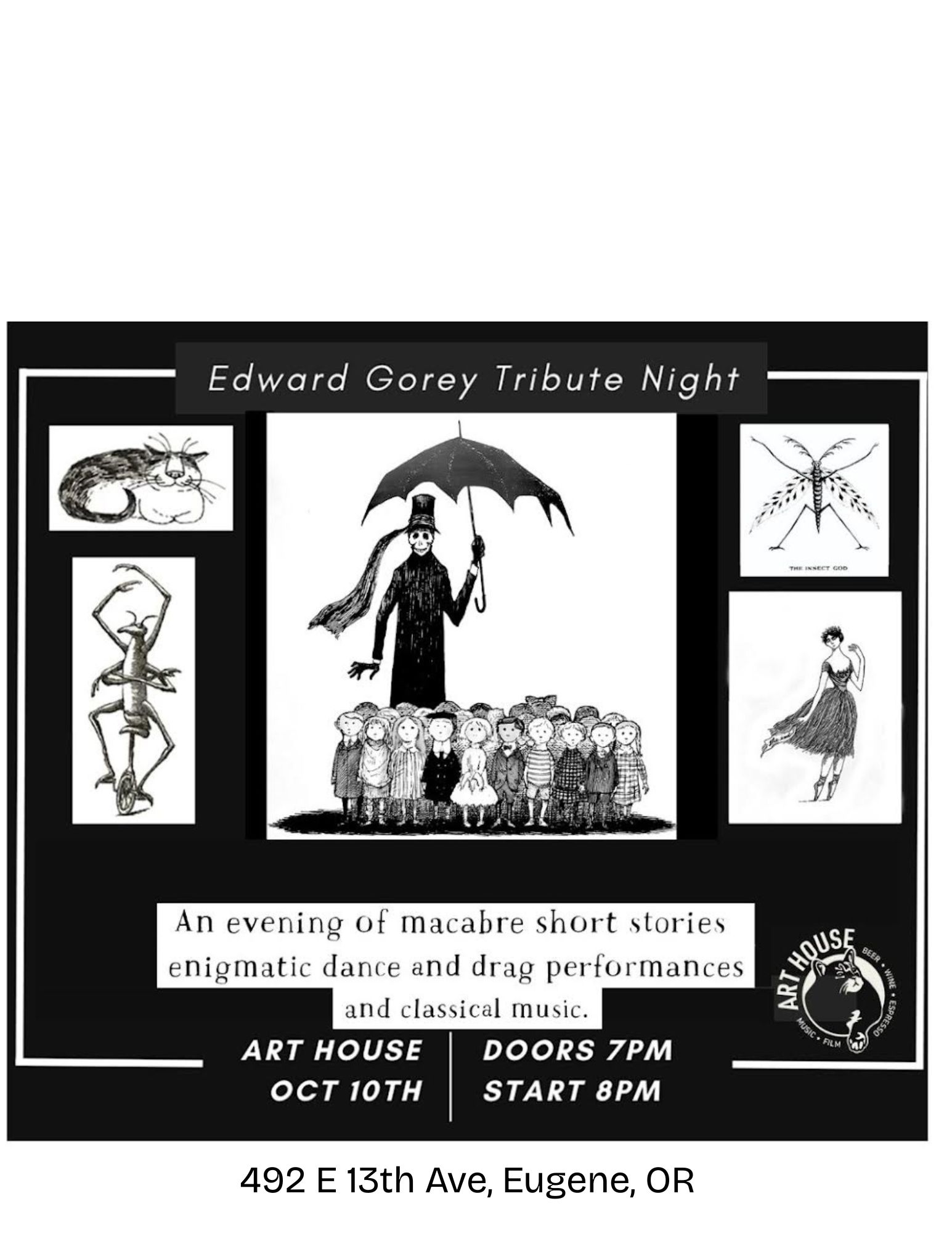 A variety of readers will perform the works of Edward Gorey with cello accompaniment. A plethora of dancers will perform, burlesque, drag, juggling and a few unusual surprises are planned. Local spooky vendors will haunt the lobby as well. Mention Edward gGorey and you’ll either hear “oh, i LOVE him” or “who? Its the 100th anniversary of his birth so many people are planning events to celebrate him. I heard of a touring show in Florida in October, and the Edward Gorey house in Cape Cod is having an event in February.