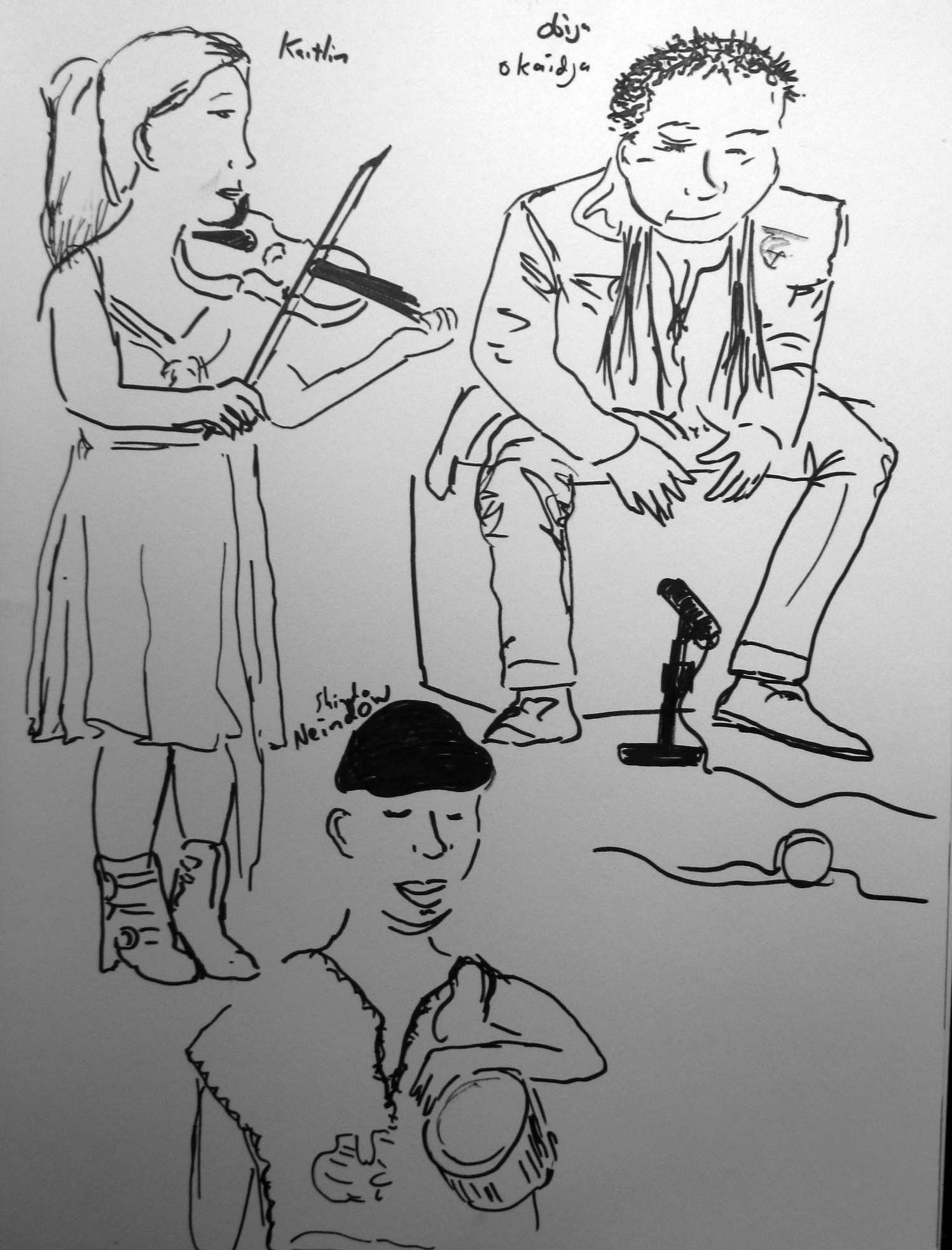 Summer 2011 drawings, Fairbanks Summer Arts Festival, The Wailers, Bill Anshell Trio, Brad Boal, Pretty Birds that Kill, Robin Dale Ford, Pat Fitzgerald, Paige Compton, Saucy Yoda, 907 Britt, New Cut Road, Avery Wolves, Ron Velez, Giacomo Gates, Mike Stevens, Raymond McClane