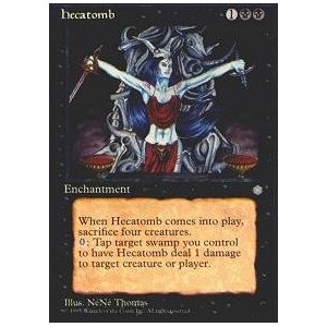 Well, Hecatomb comes to mind, and would have been synergistic with the other two effects. They may have thought of it and shot it down as being too similar to Koth of the Hammer. The effect makes more sense in red these days. Maybe it could have been “remove a card in your graveyard from the game to do 1 damage to any creature or player.” I