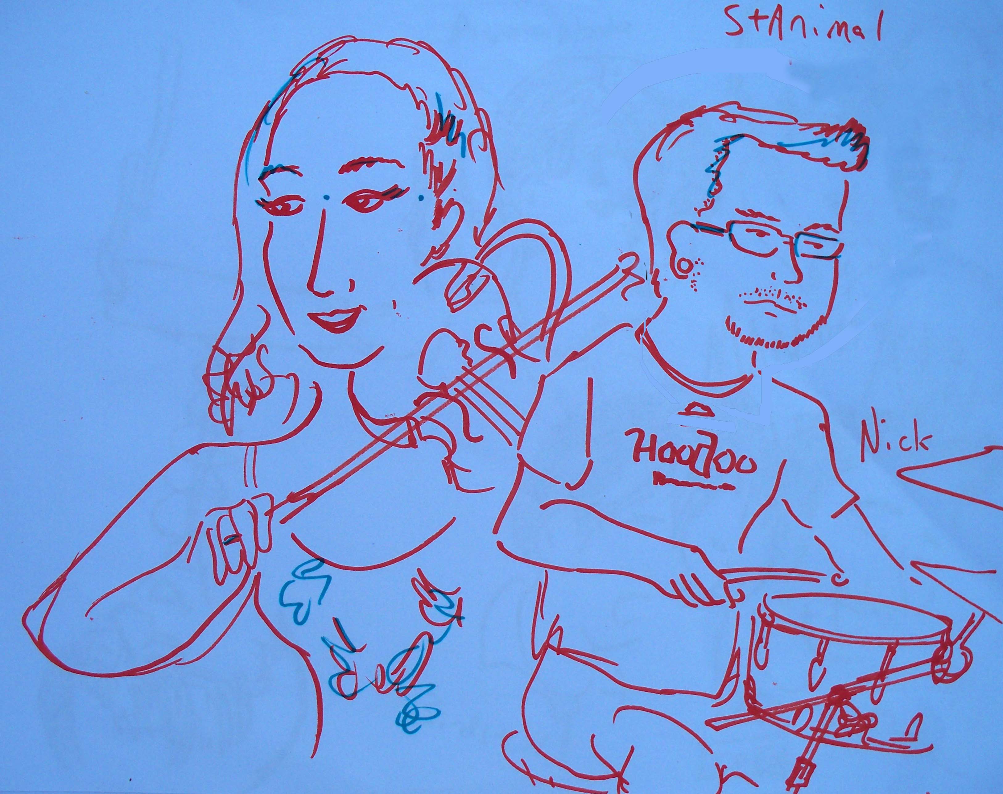100_2313St Animal played at the Boatel last weekend. They play an exciting blend of rock funk and reggae with mandolin, violin, trombone and trumpet. The band rose from the ashes of the breakup of The Good Daze, and they sound a lot better now than the Good Daze did. Jerimiah is a stable, confidant guitar player, and his original songs are awesome and blend well with Masons. Karlan and Nick are depicted below. They are an awesome band, catch them live!  stanimalgood