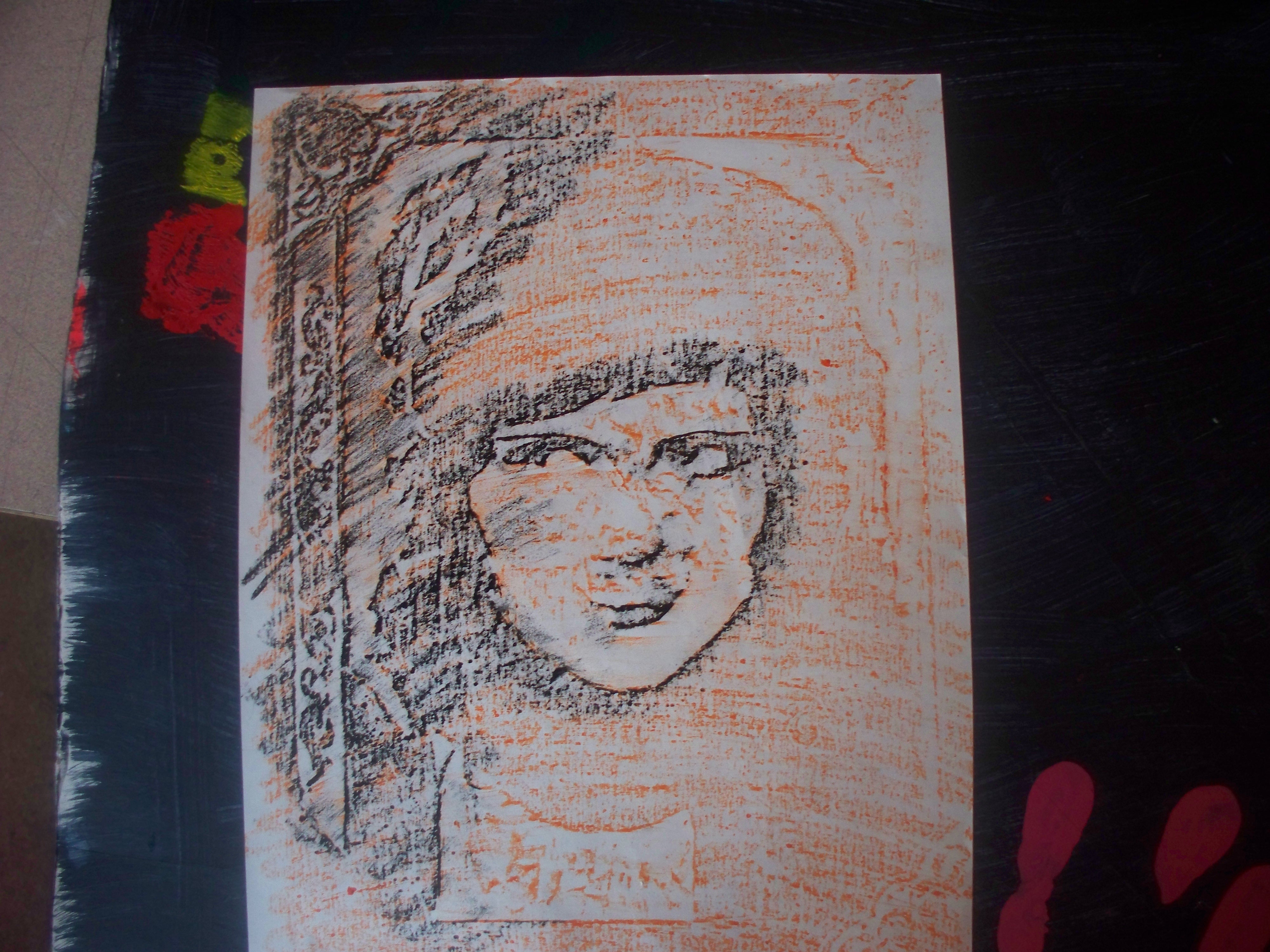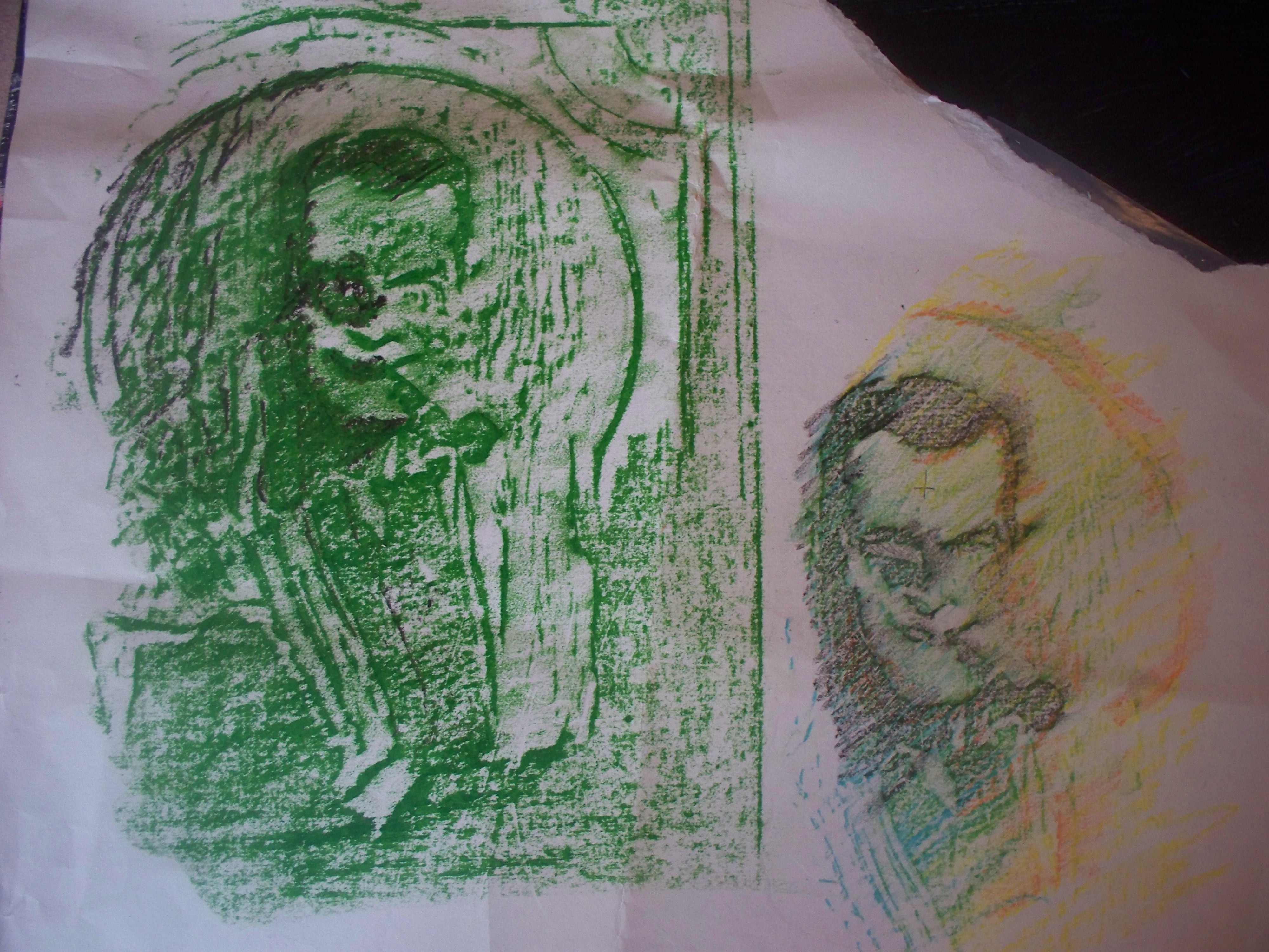 This is a crayon rubbing. Its done while I am carving to tell me where I need to take away more wood. Funny that the face looks fine in the rubbing but then looks all shaded on her face. Still looks cool though eh? Also I am excited and proud of the lettering, I gave the capital C extra flourishes and I improvised the B in an attempt to get it to match. Woodcuts are fun and my teenage students are enjoying them too. I like when they all work quietly for 20+ hours on a project. And when they don’t turn on slipknot or Dubstep or gangsta rap that glorifies violence and drugs.