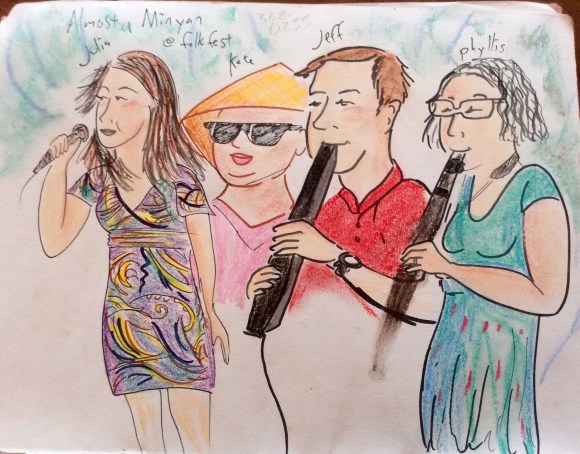 This group, though they remind us they are not all Jewish, love to play traditional Jewish music. Two clarinets and a midi breath controller making trumpet noises provided the harmonies, and two vocalists sang lyrics in English and Hebrew. I liked a line about, “I’m in love with the guy who says yes to the boss’s assistant’s assistant.”
