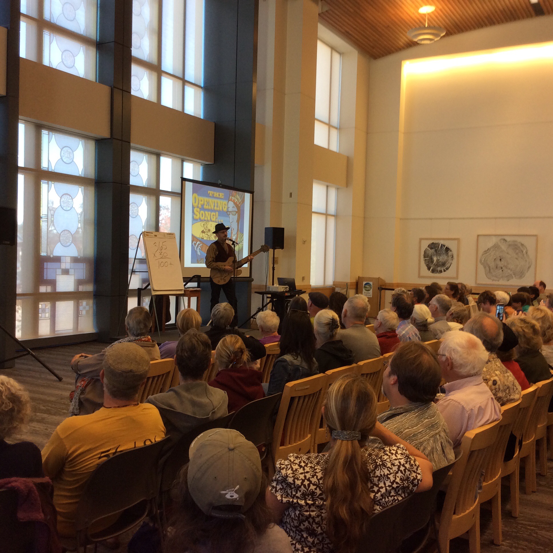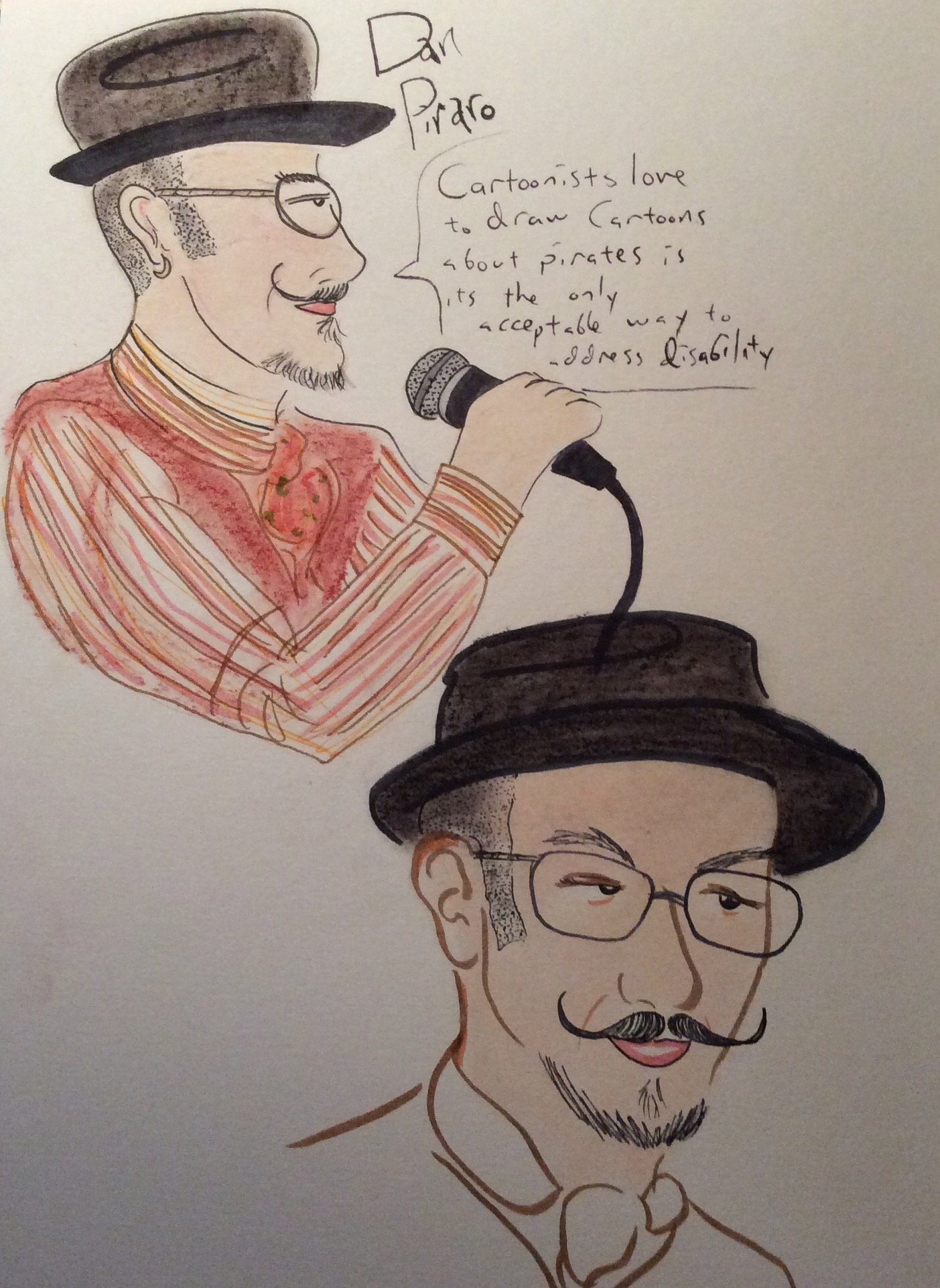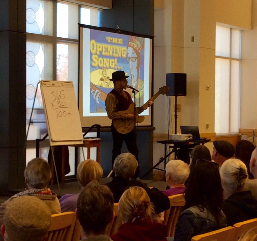 Funny Times cartoonist Dan Piraro came to Eugene to give us a lecture about making comics… er, except he didn’t at all and gave us a 2 pm stand up comedy show that included playing a cardboard guitar, drawing audience member portraits, many silly puns and harming ” behind the scenes” hints about some of his best cartoons projected on a screen.