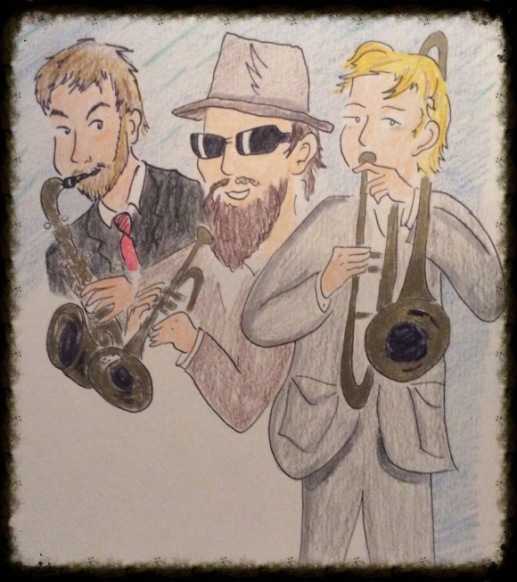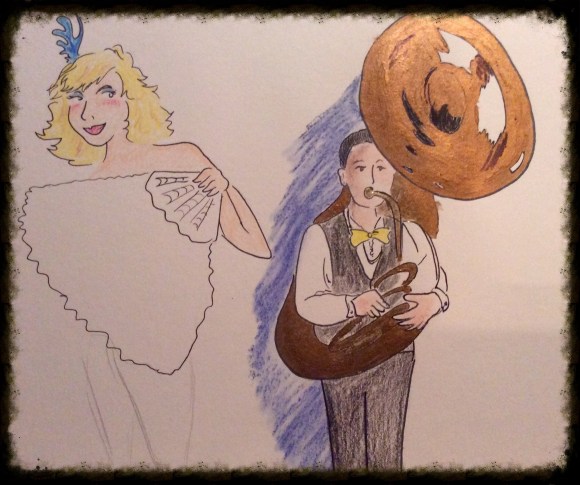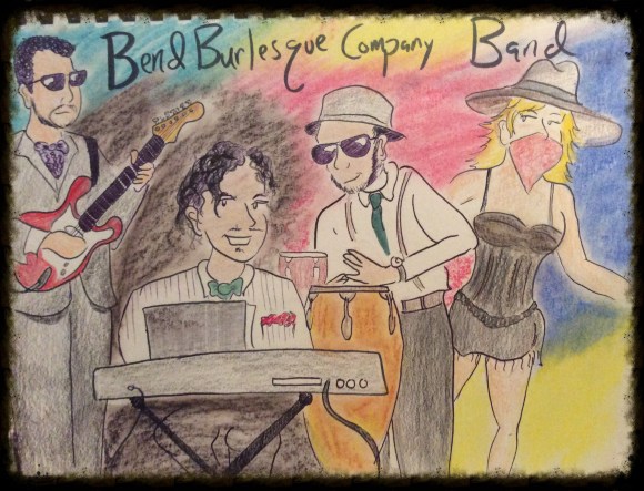 I made some drawings of the Bend Burlesqe Co. A full band with horns, four dancers, humor, and a charming host.