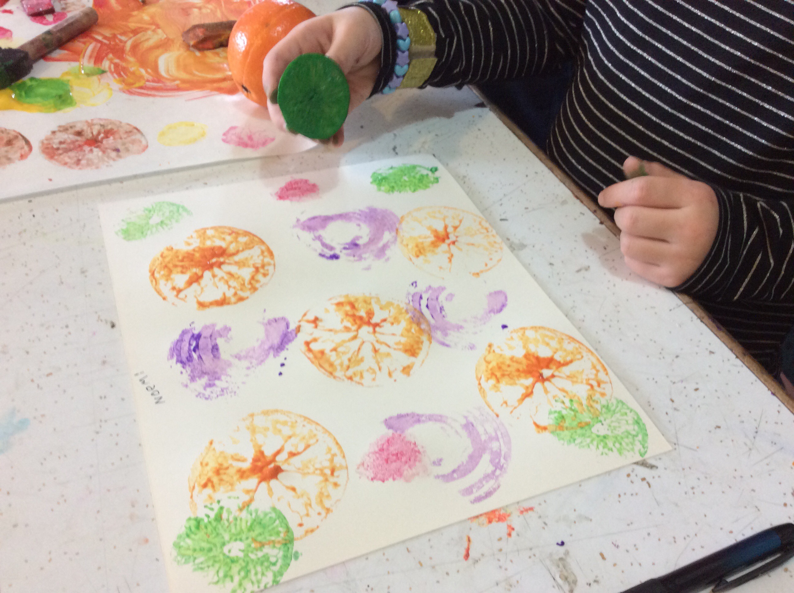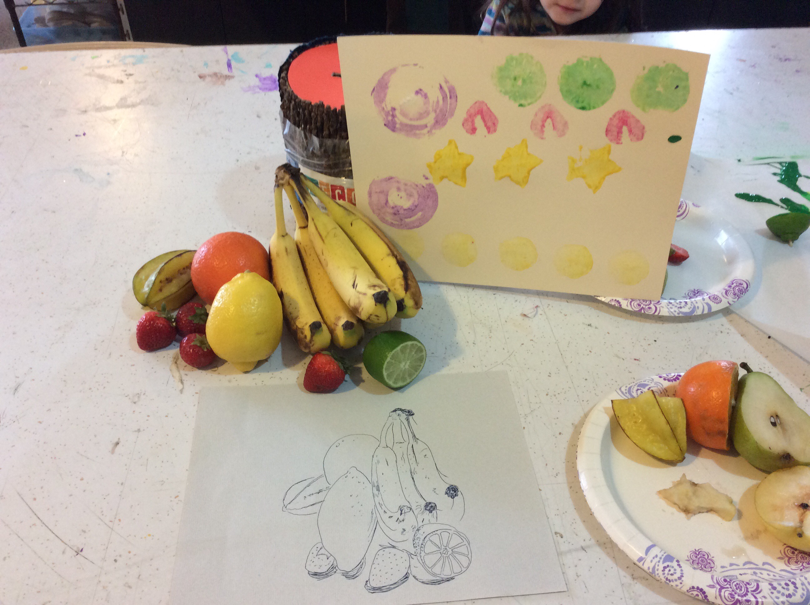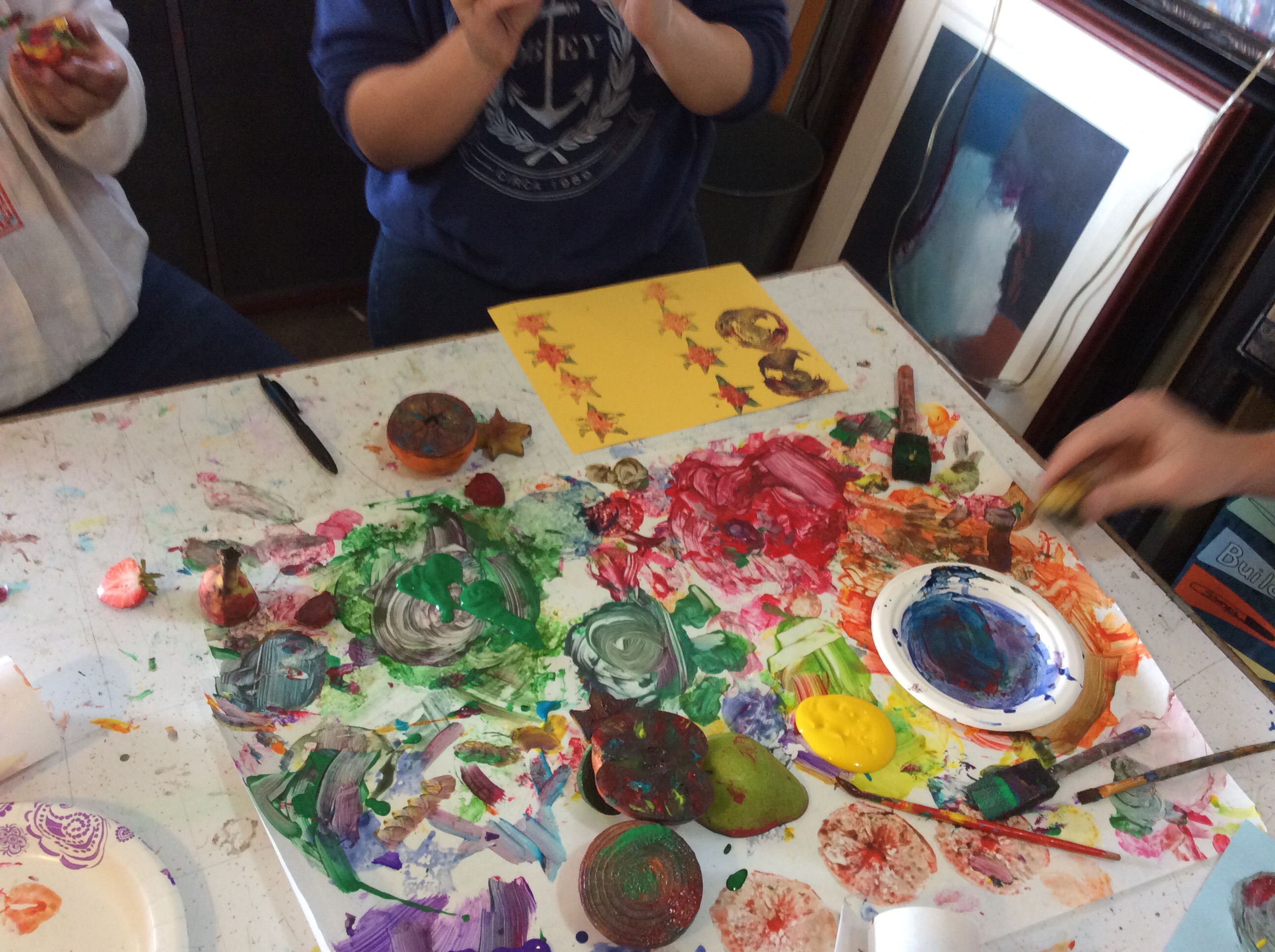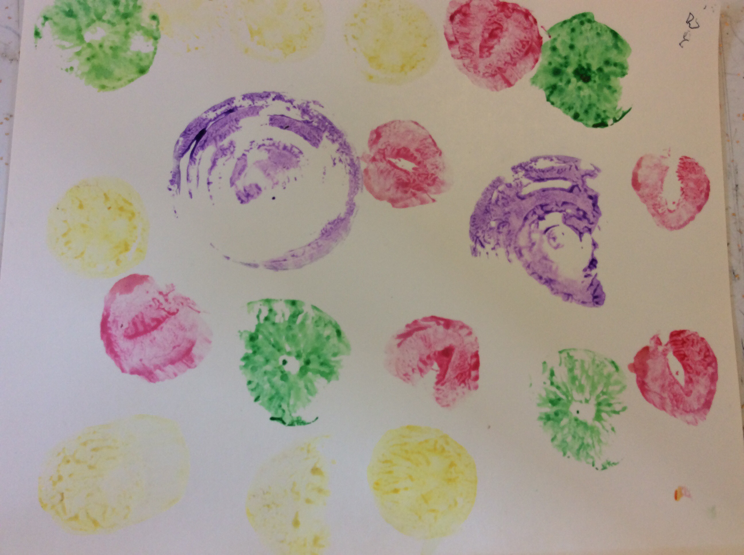 We painted with tempura and watercolor paints on to a piece of cut fruit, we used strawberries, bananas, oranges, star fruit, a lime and an onion. We found that limes and starfruits worked the best.