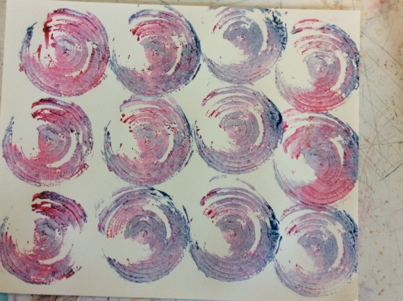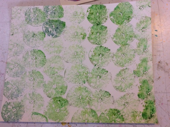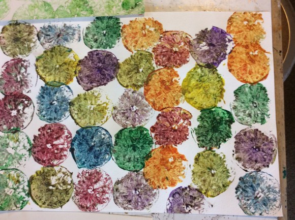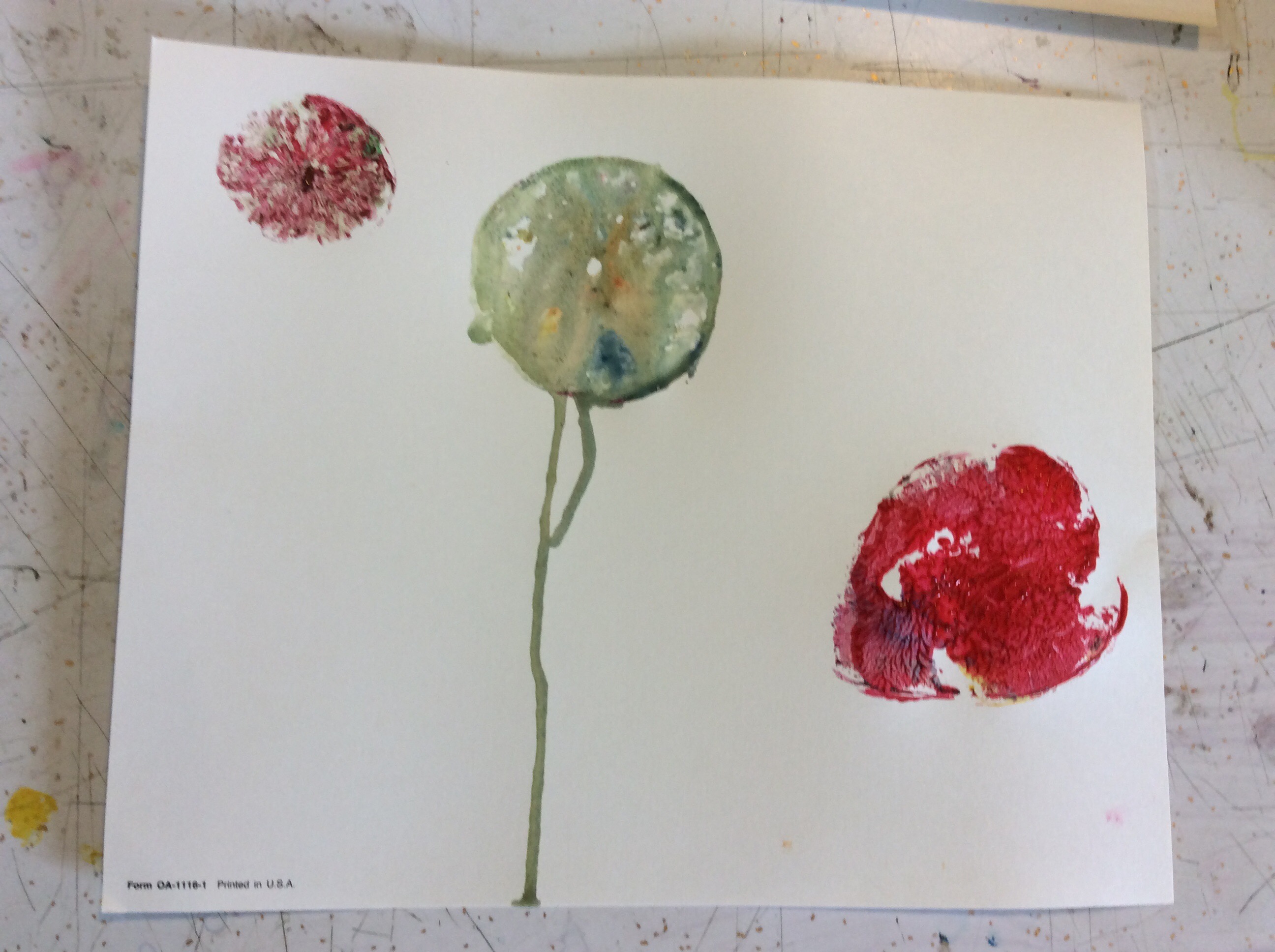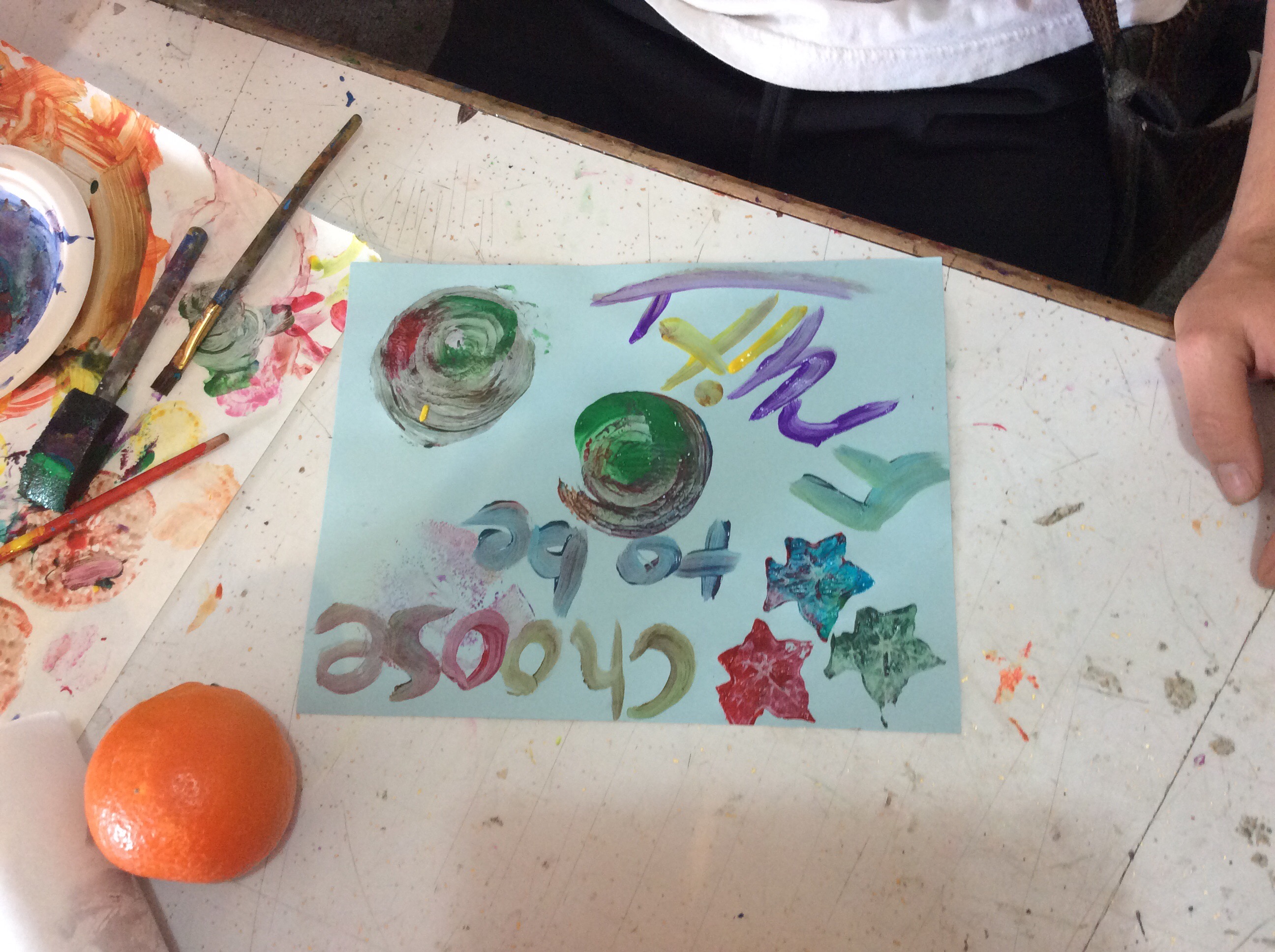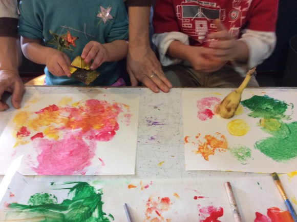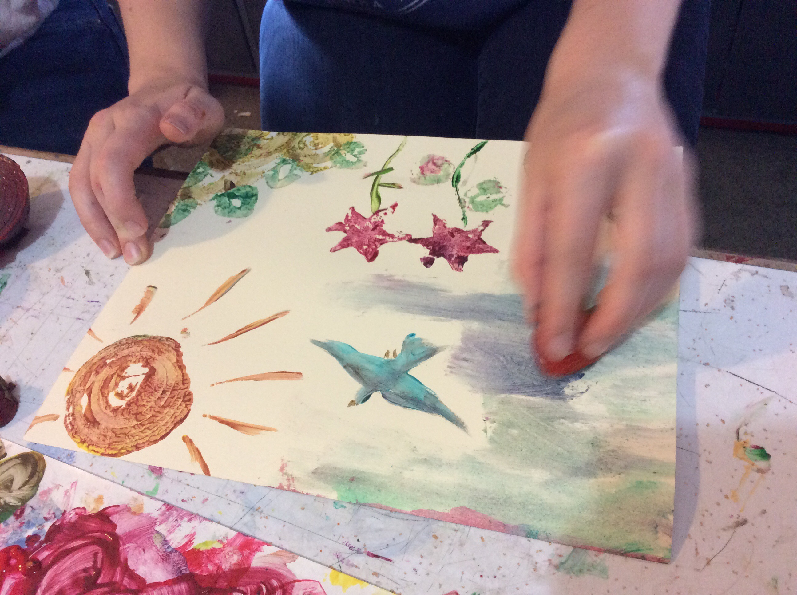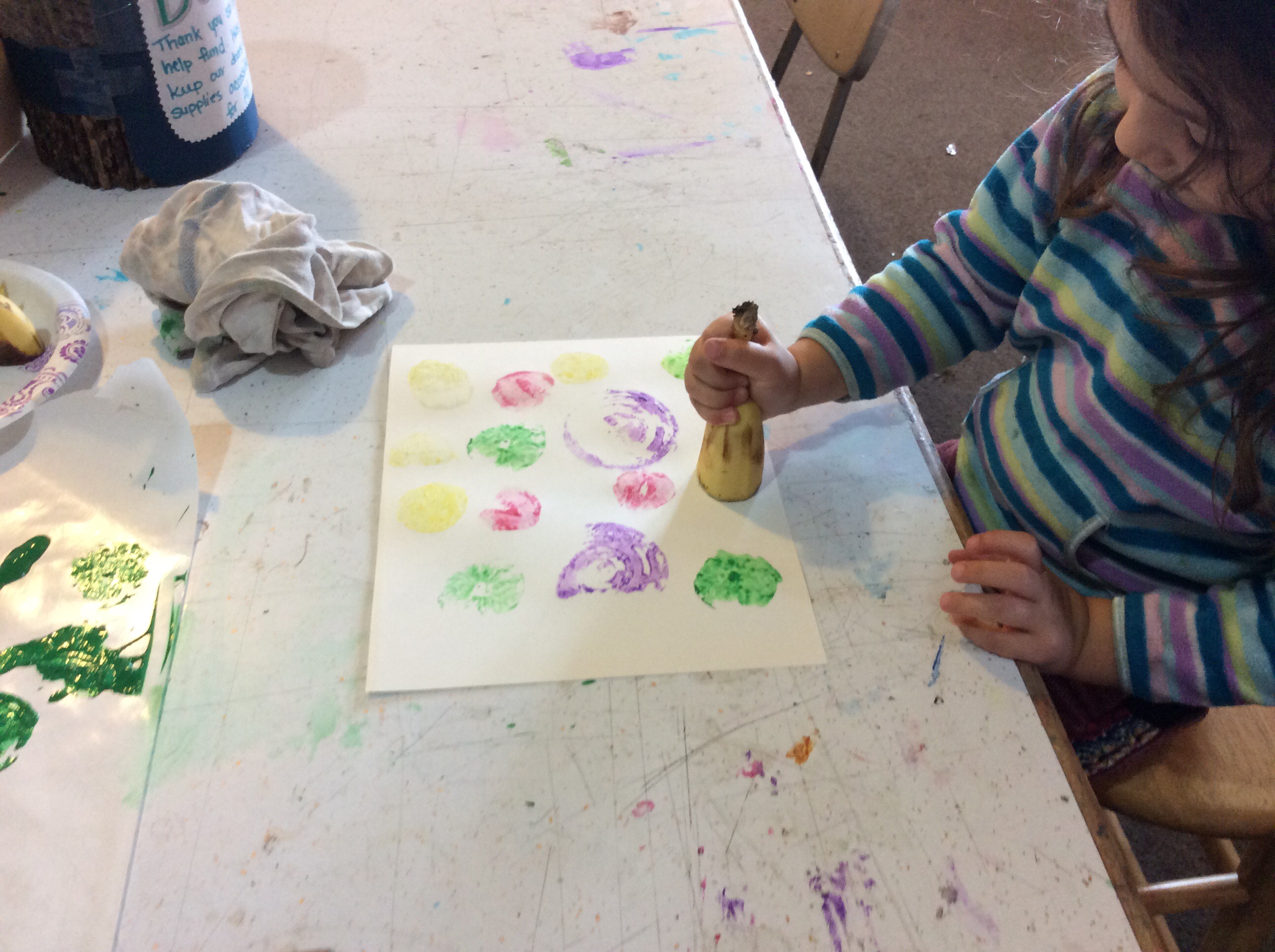 We painted with tempura and watercolor paints on to a piece of cut fruit, we used strawberries, bananas, oranges, star fruit, a lime and an onion. We found that limes and starfruits worked the best.