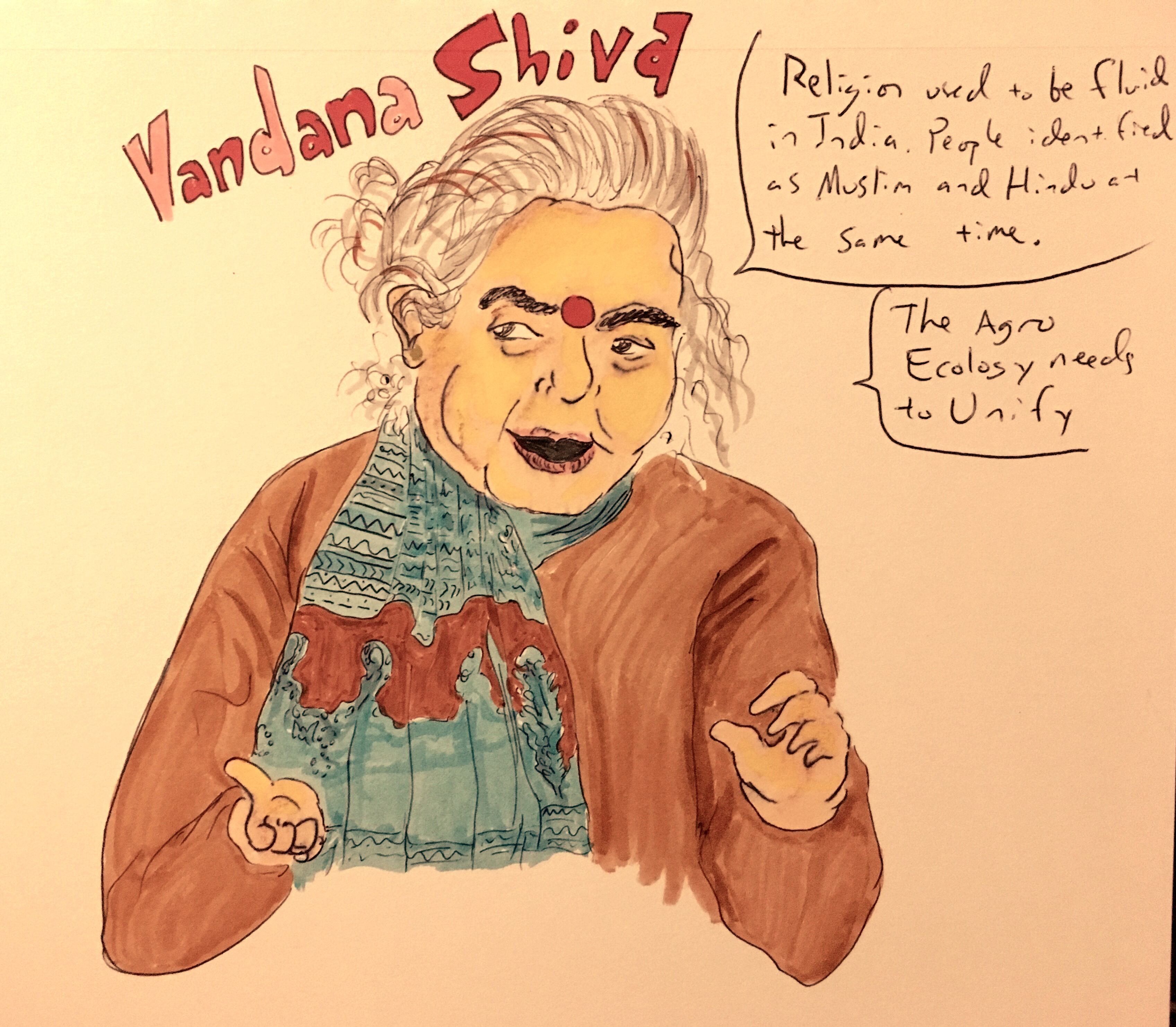 Vendana Shiva is a controversial figure. Her stance against GMOs has received a lot of criticism but I appreciated some of the things she said, such that we could boycott Coke a Cola to send a message! The corporations are merging, giving us fewer targets to oppose! Her scarf looked totally cool and was a fun challenge to draw.