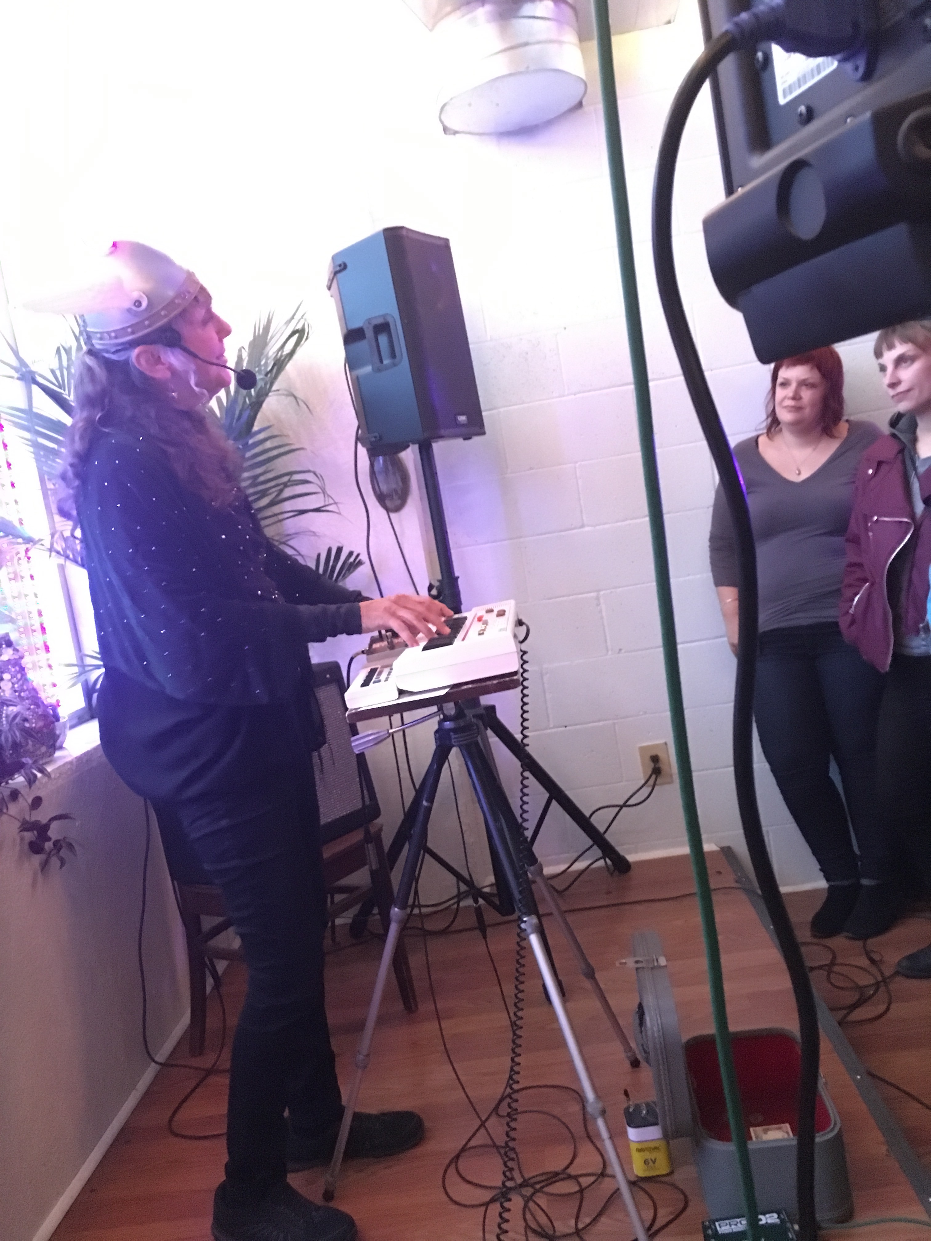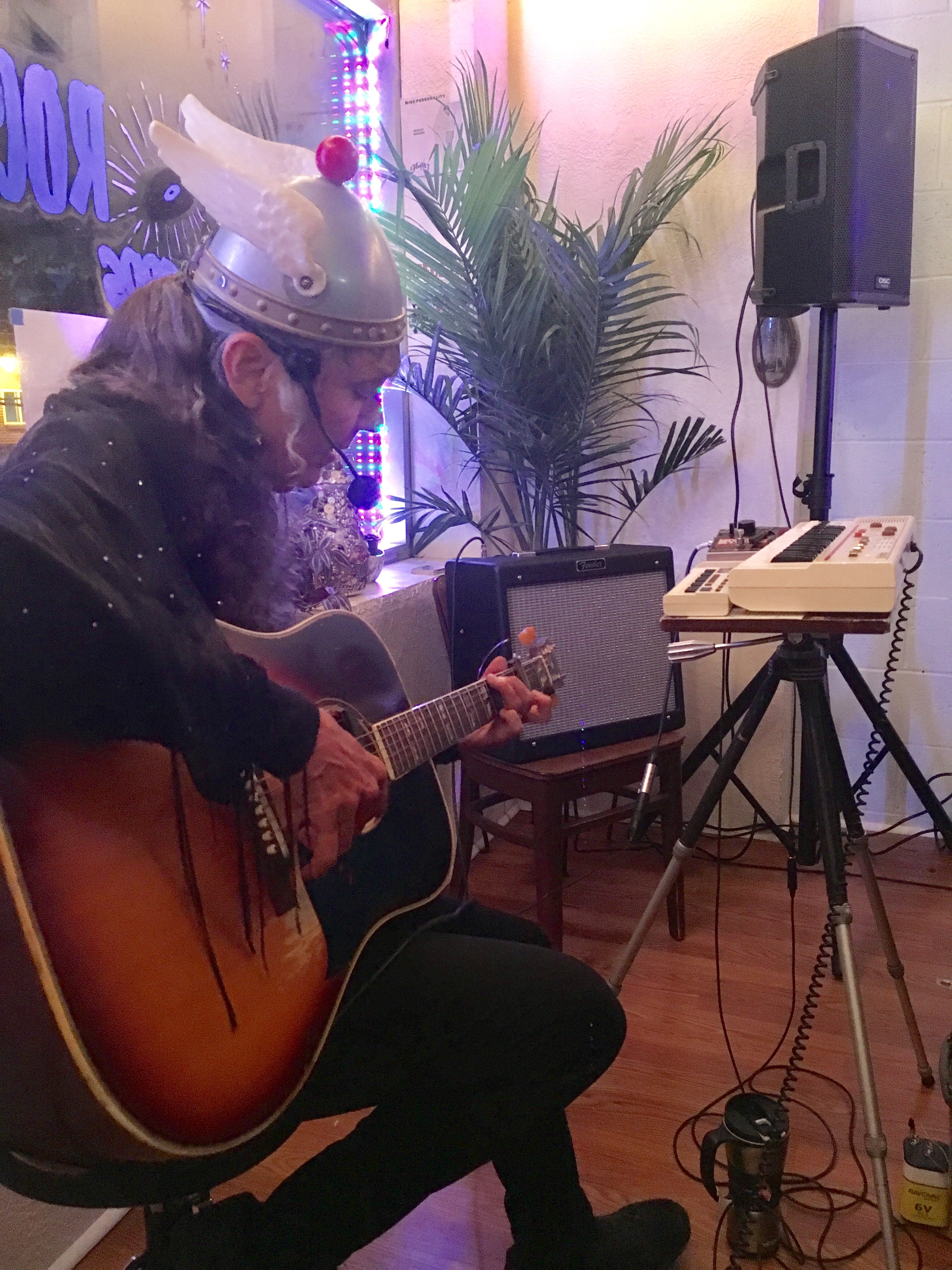 The space lady used to busk on the street in San Fransisco or in subways. Now she’s playing to large crowds who love her weird unusual take on classic rock covers and her sweet original lyrics and stage persona. She plays Casio keyboards into a heavy phaser effect and uses the tinny drum machines that came with those old casios… then she sings, sometimes changing the melody of the original song wildly and manipulating a delay effect on her voice while she plays keys. It’s a unique show for sure! She also picked up the guitar for a few songs and led the crowd in singalongs, encouraging us to love each other and realize our best selves! Check her out at her Facebook page.