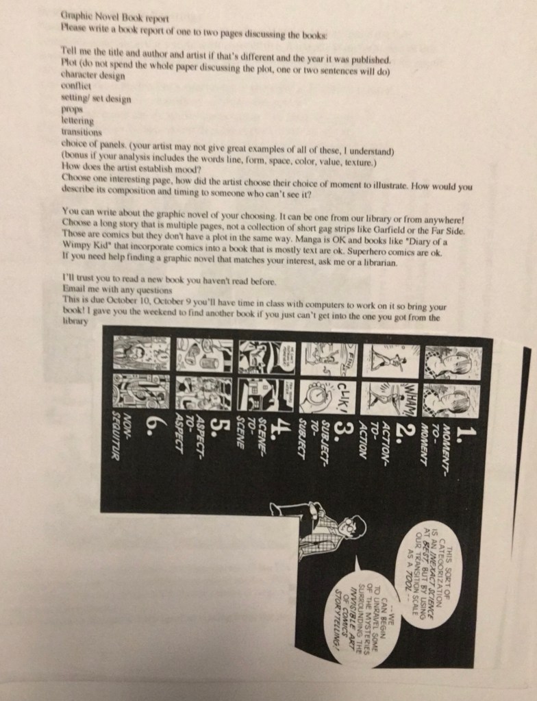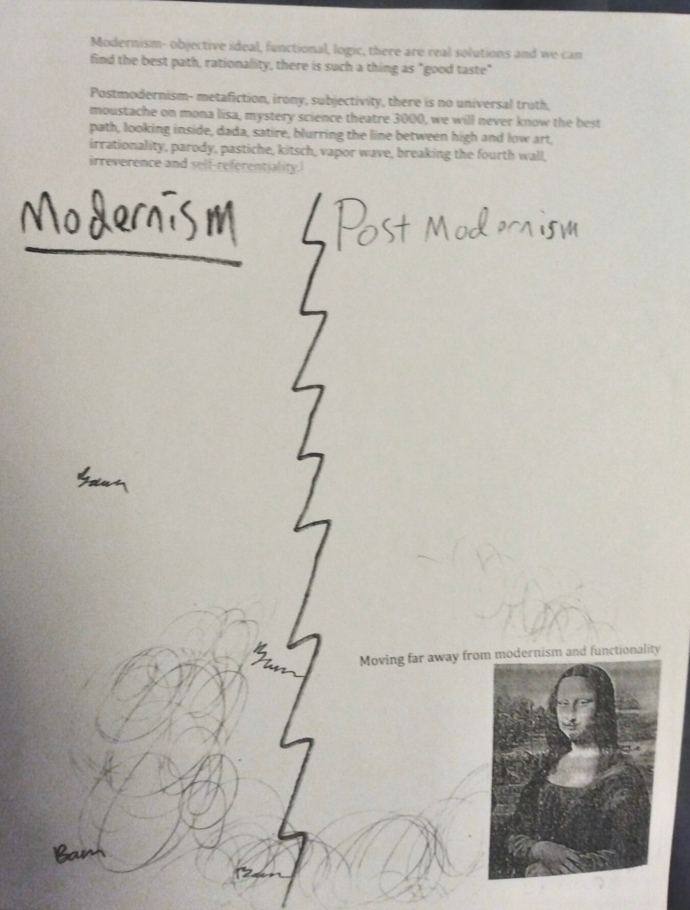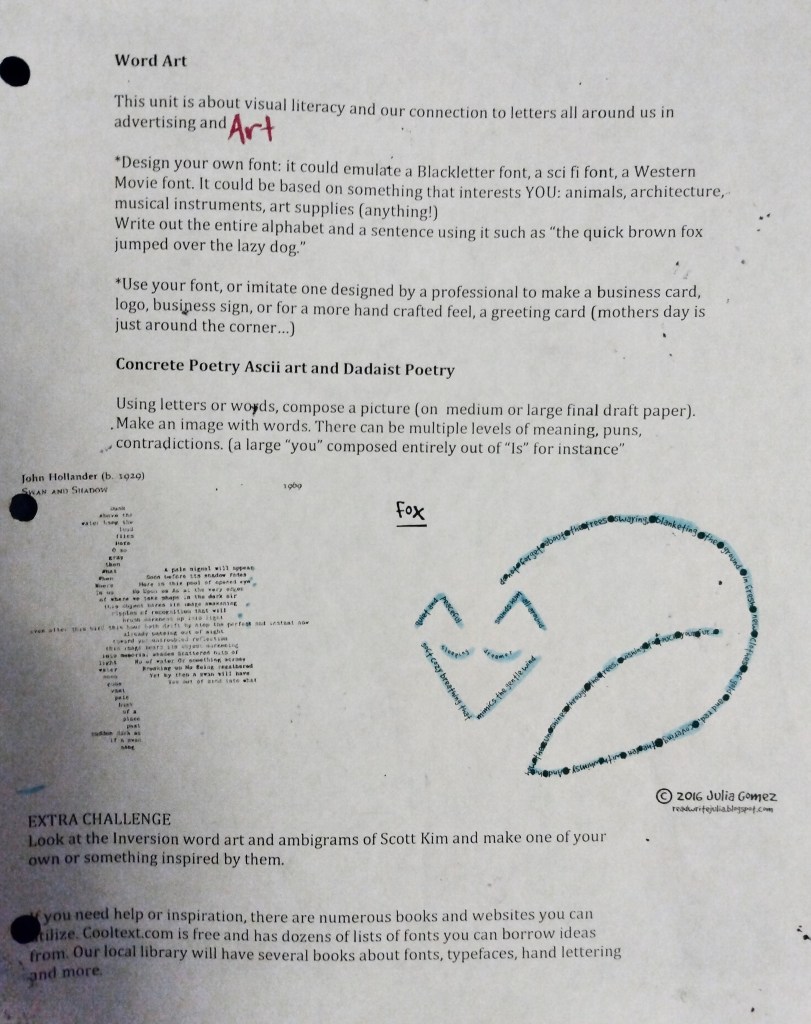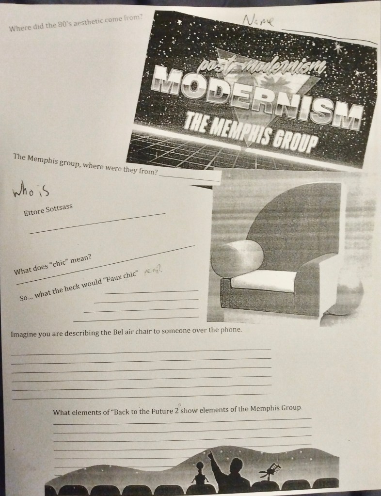 We did a lesson on word art and fonts.It’s important for students to reflect on their art. Some students were reluctant, but others gave thoughtful answers and provided me with feedback about what they enjoyed and what they learned.After demonstrating some analysis of comics and I had students check out a library book and write a book report on a graphic novel. This usually got them to write more words than any other assignment. The Memphis group and it’s fashion over function style served as an introduction to Postmodernism. I also showed a clip from “back to the future 2” I asked students to put art they found into one of these two camps and explain why they put them there.