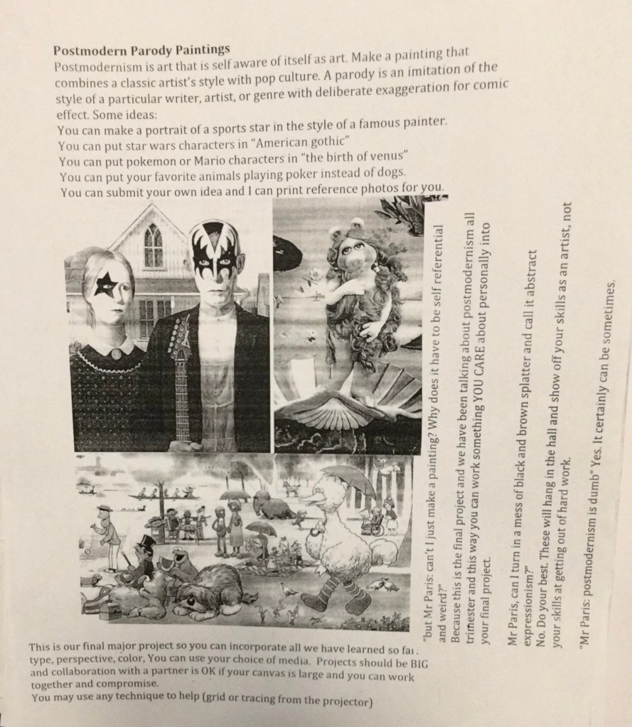 The final project of art class was a “postmodern parody painting.” I asked students to recreate a famous piece but change something to make it relevant to them or mix in some pop culture. This was a project students could do in small groups if their canvas was large.