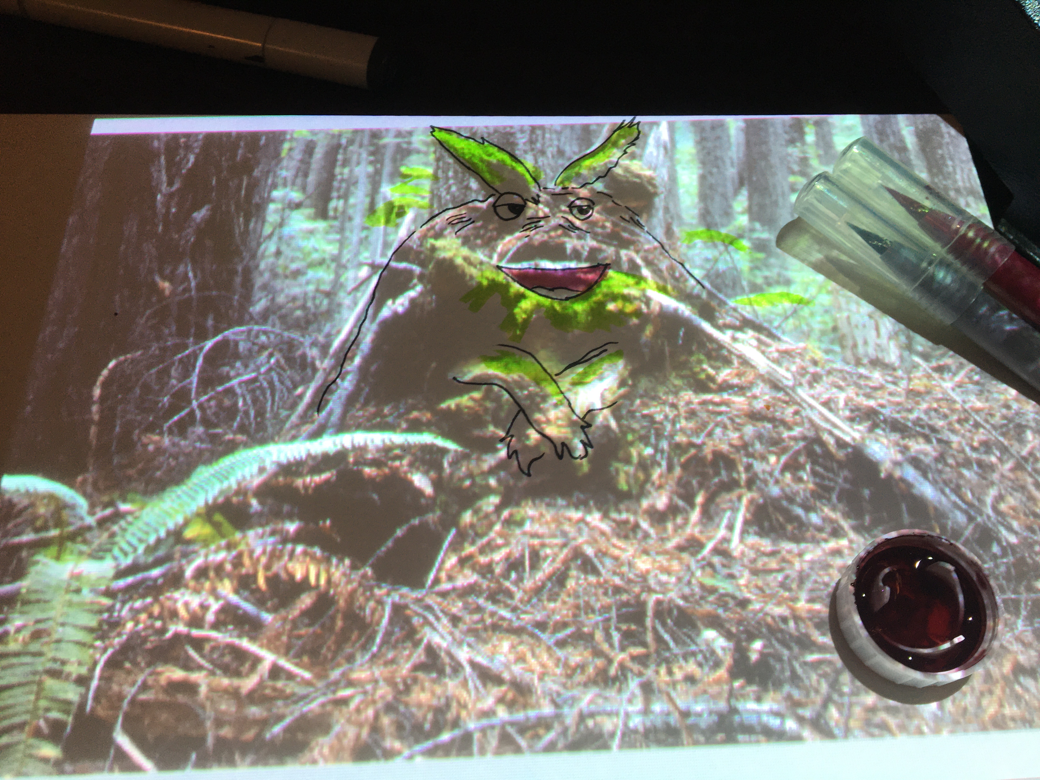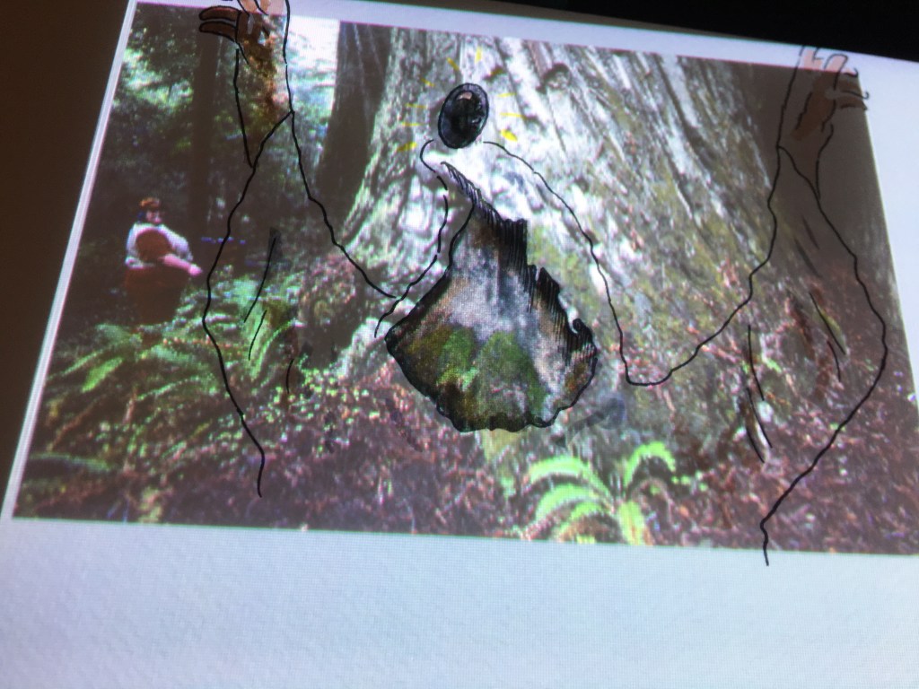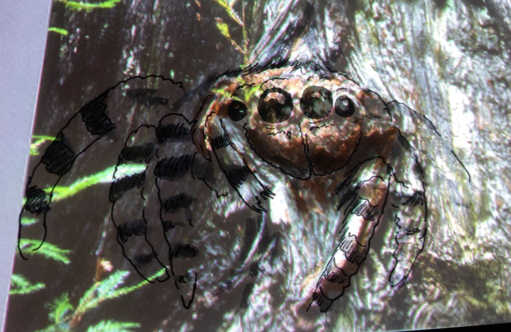 While walking, I took many photos of the trees and logs, burls and growths. I saw some mushrooms and some lichen. I thought of how the blank page or canvas in front of an artist can be so daunting, and thought I’d demonstrate how an artist could take photos (by themselves, or by others) and look in them for faces or figures.