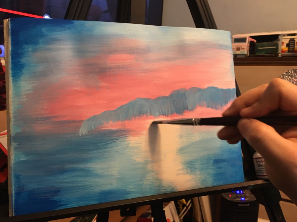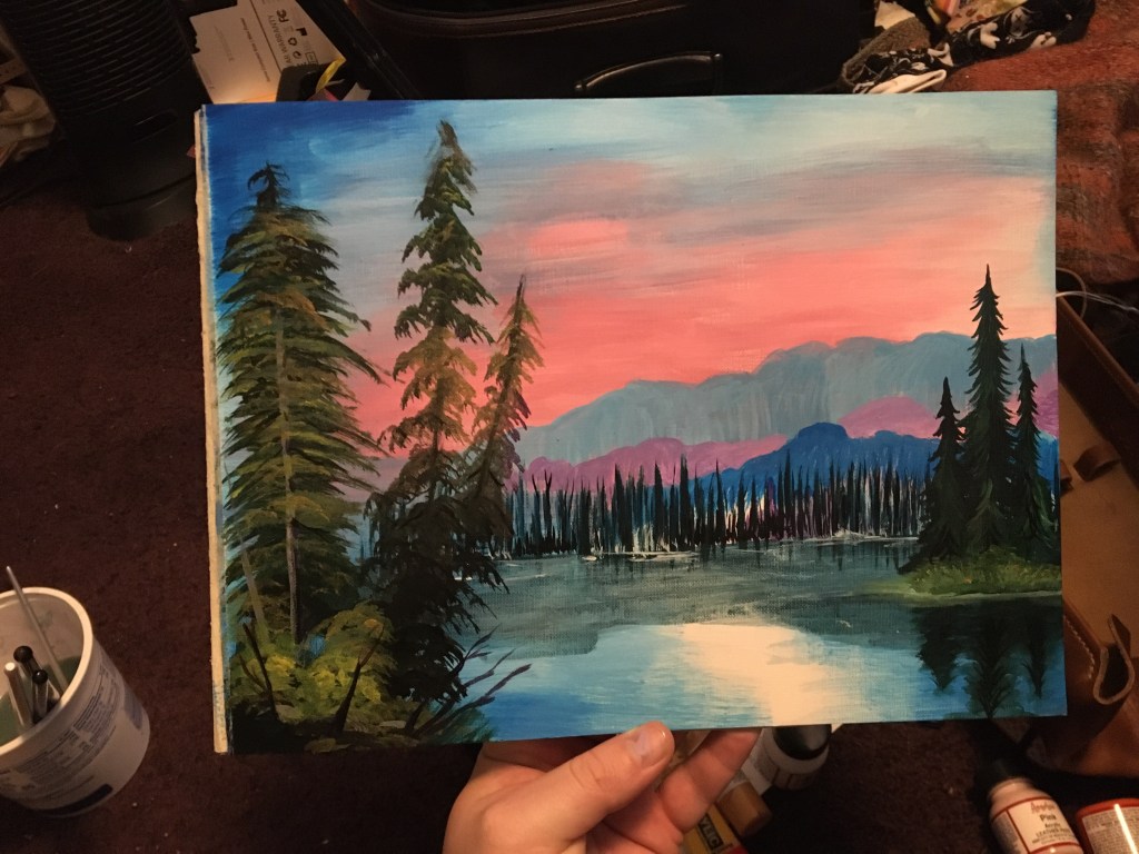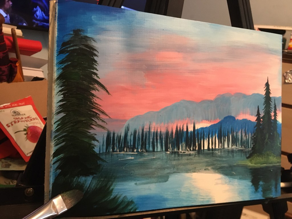 As an artist we go through phases where we might condemn some art as being tacky, commercial, vapid, and then we may come around eventually to enjoying it. That’s how I was for Bob Ross’ work and so today, at the age of 39 I painted my first Bob Ross style painting. I have seen children paint beautiful pieces following along with bob ross. He’s so gentle and funny in a subtle way. I can really see how he became so popular, it isn’t just the art: it’s the cute things bob says as he paints that make the show watchable.