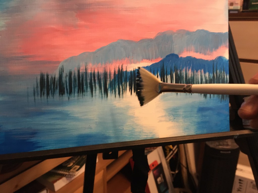 I thought it would be fun to use an airbrush to do the sky. Maybe I’ll try that with my next project, get some lovely gradient blending that wayThe fan brush was used to paint these vertical background trees. In mine they look like they have been hit with a forest fire that has burned of their branches.Next I painted in the water reflection and some foreground treesNot bad… but I left some pink in the background above the mountains and I thought the tree on the far left had too much light tone in its trunk, so I tidied that up and put some more in the water: too much contrast between the green reflection and the sky blue water Leaving a bit of white in the background makes some interesting mist . The sky looks more orange here on the phone than it does irl.