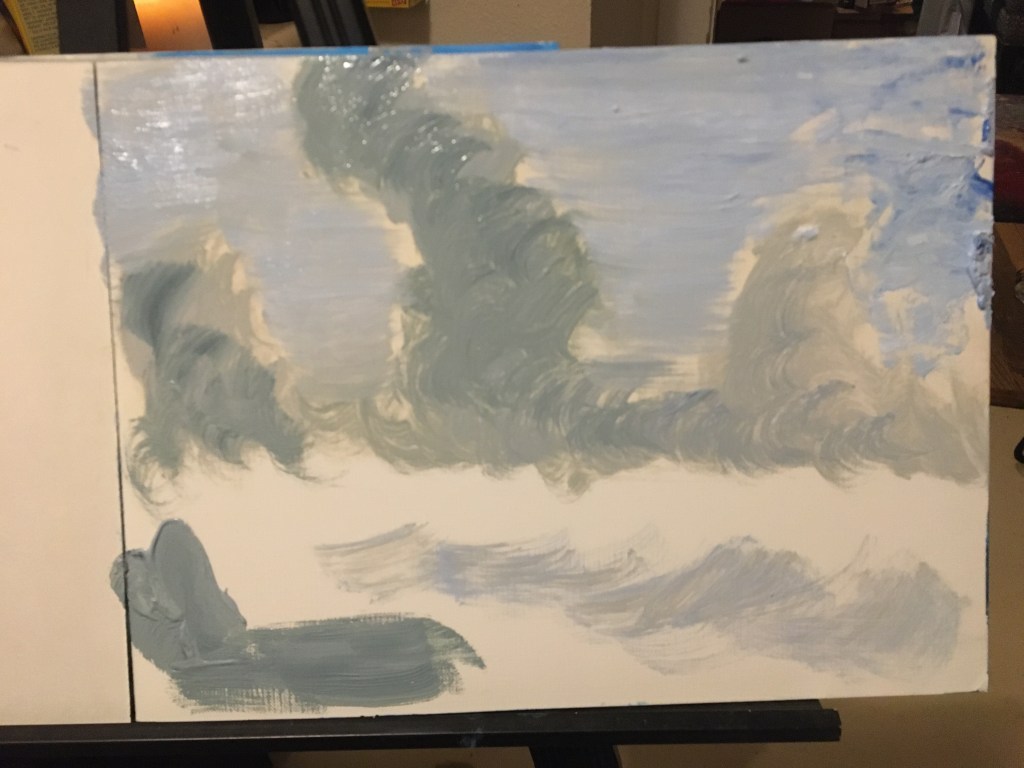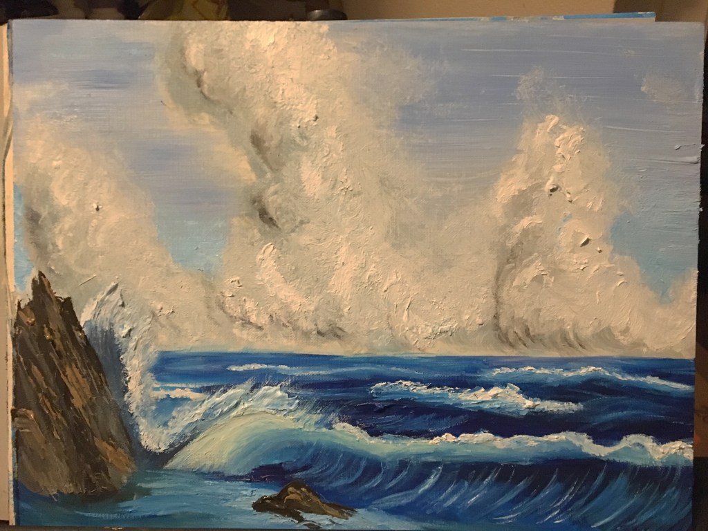 Surf’s Up season 9 episode 2Just the cloudsPainting in some dark wAterAdded the rocks with a palate knife and the white fluffy foam on top of the waves, you can almost hear it!