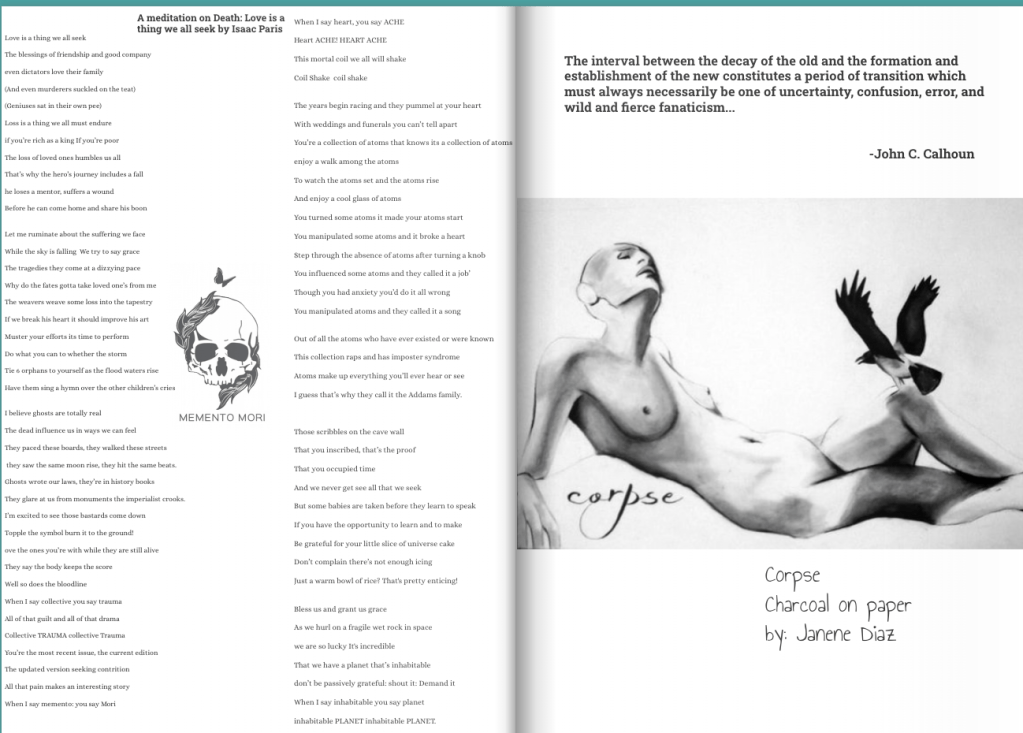 the poem is “a rumination on death” and the audio version of it can be heard here. I played guitar and did production, but my good friend Craig Brookes played bass and added drums and helped with production. It also has good friends contributing to the background noises and shouting parts.