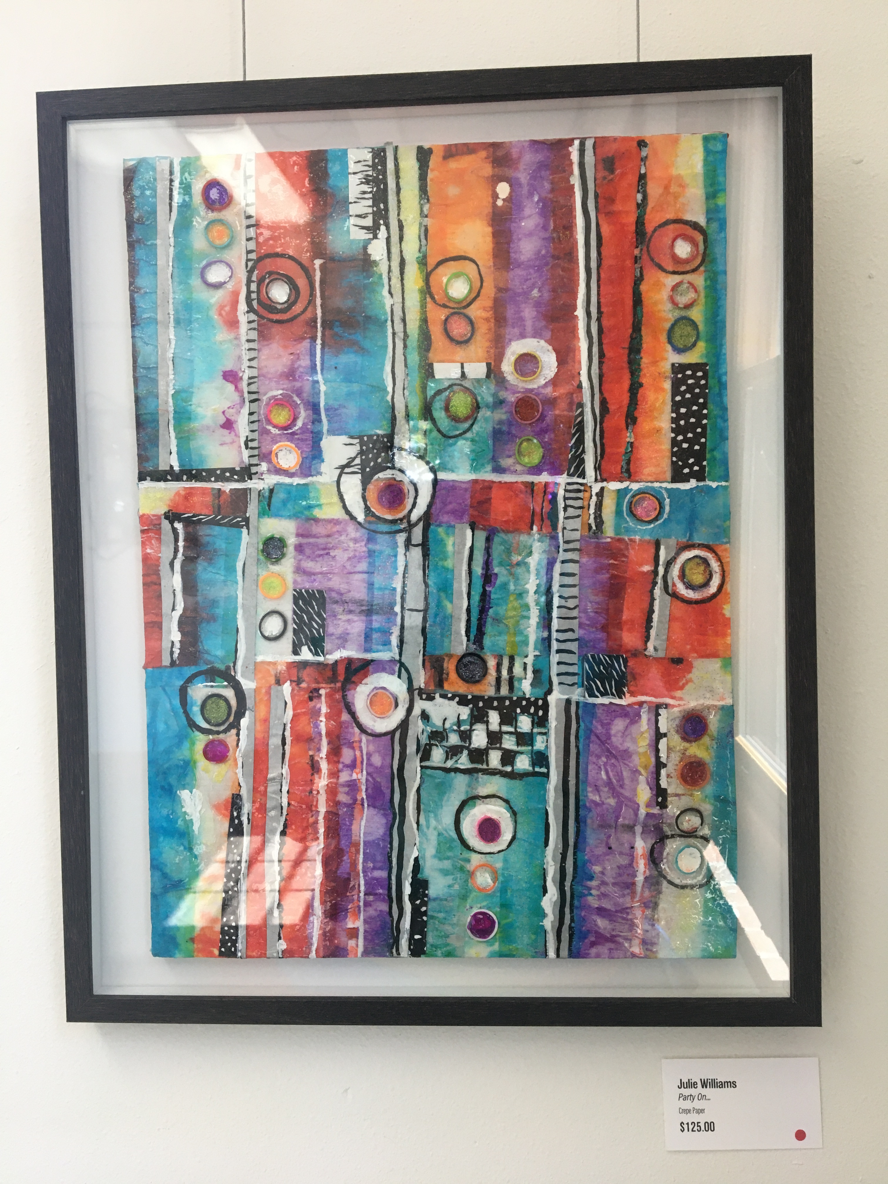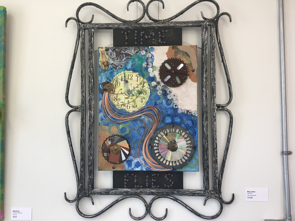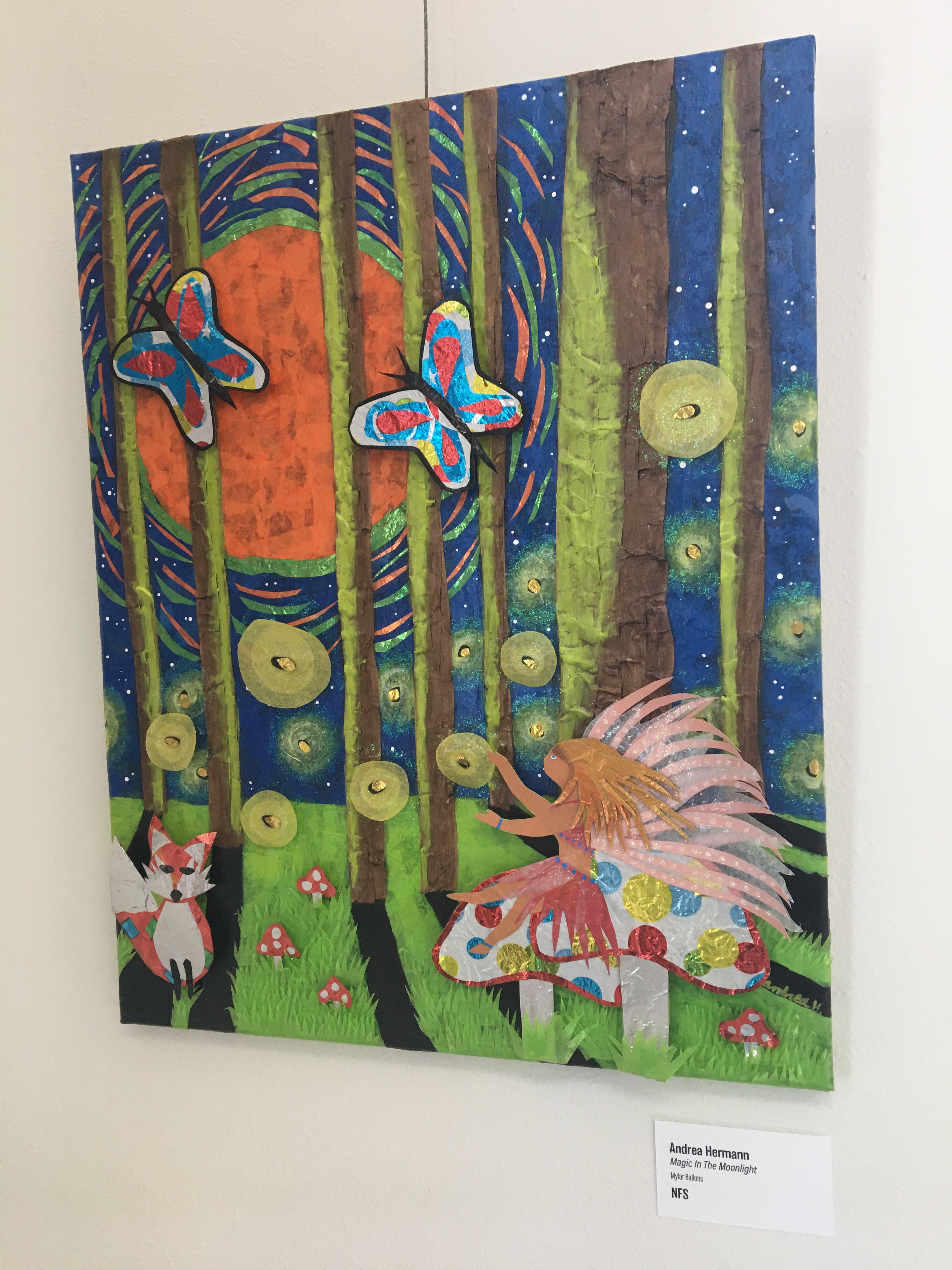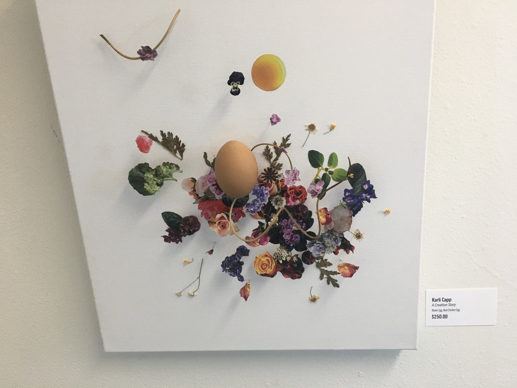 This piece is one of my favorites, I voted for it as best of show. It combines paint, real elements from flowers and laminated color photographs of flowers leaping off the campus, really showing the strengths of mixed media in an exciting way.