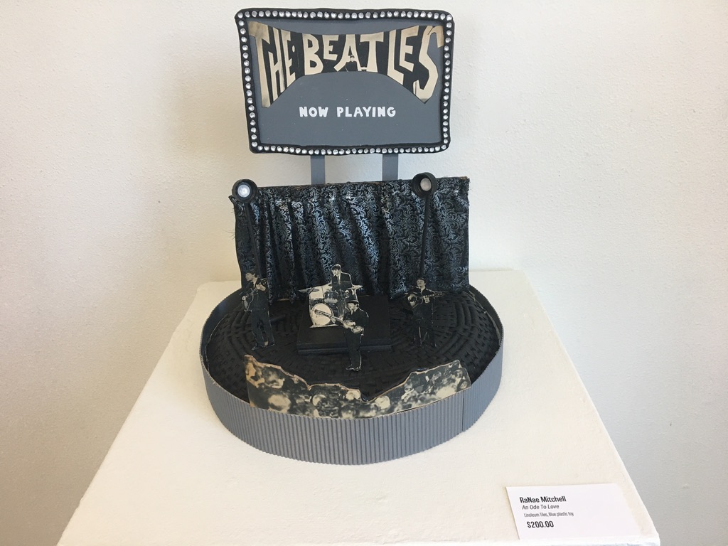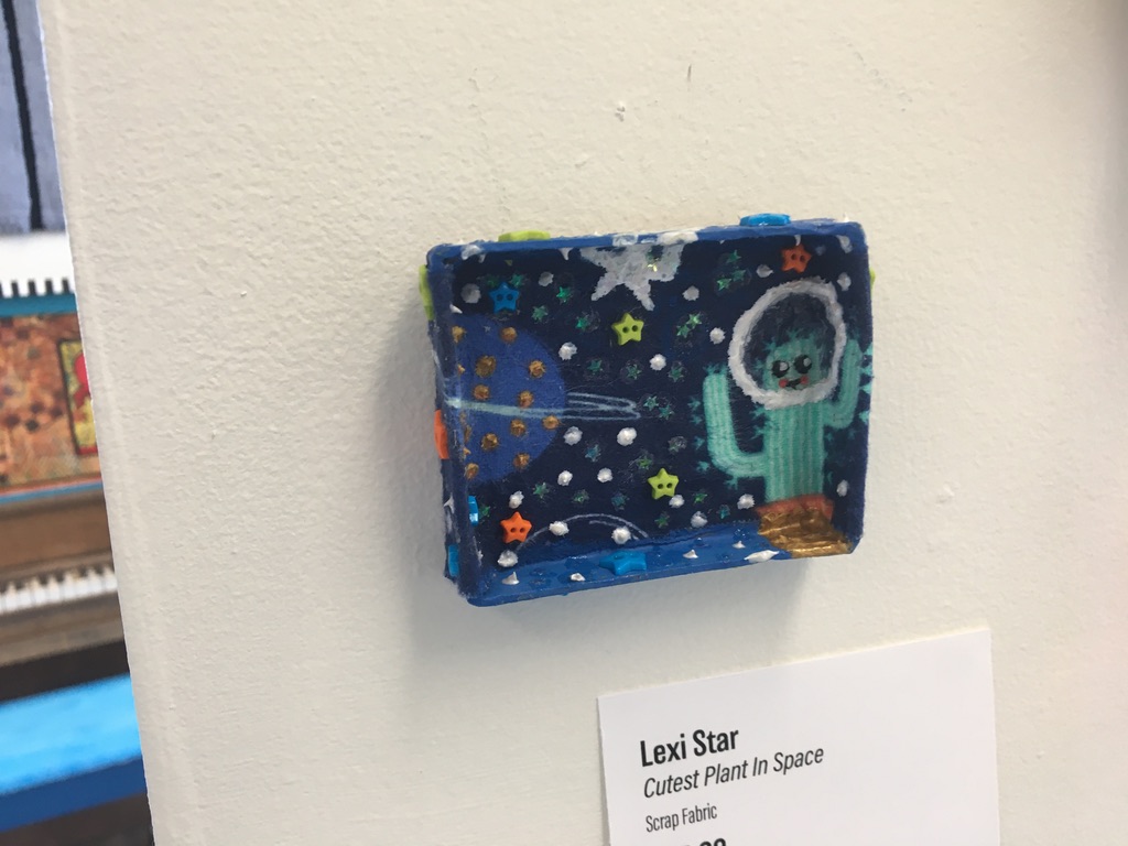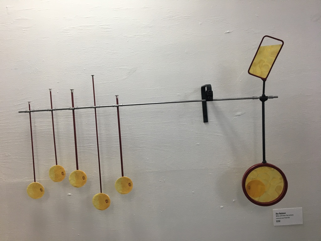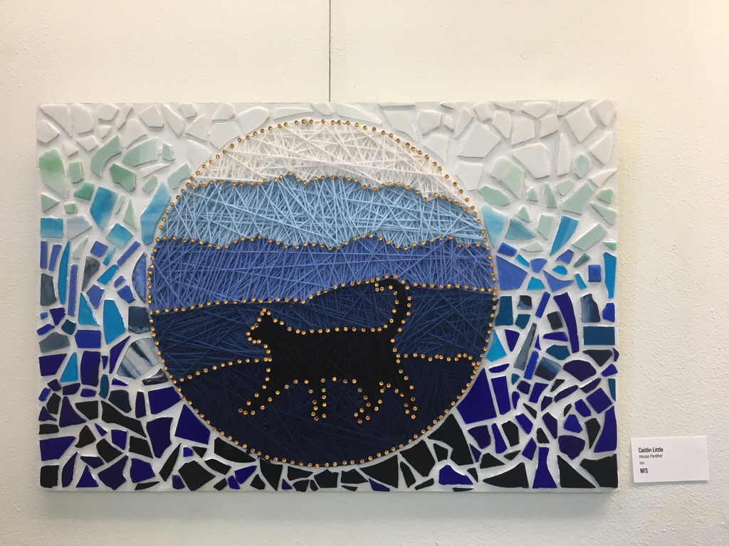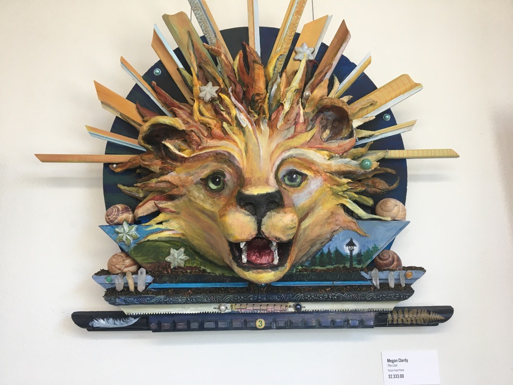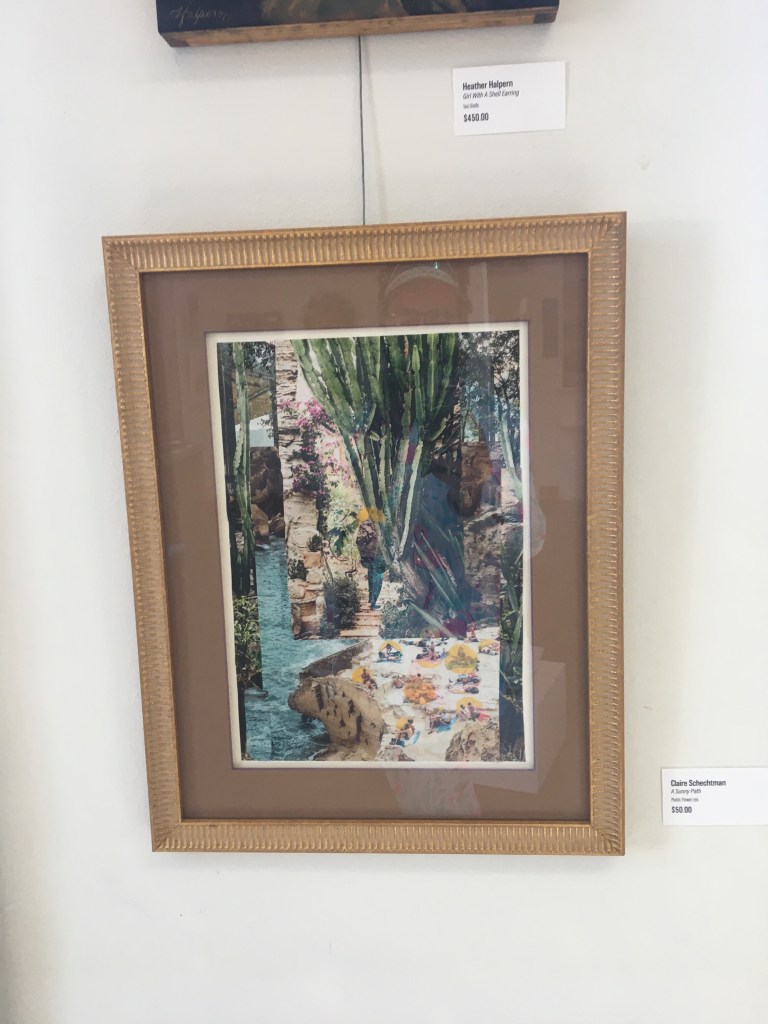 This piece is one of my favorites, I voted for it as best of show. It combines paint, real elements from flowers and laminated color photographs of flowers leaping off the campus, really showing the strengths of mixed media in an exciting way.