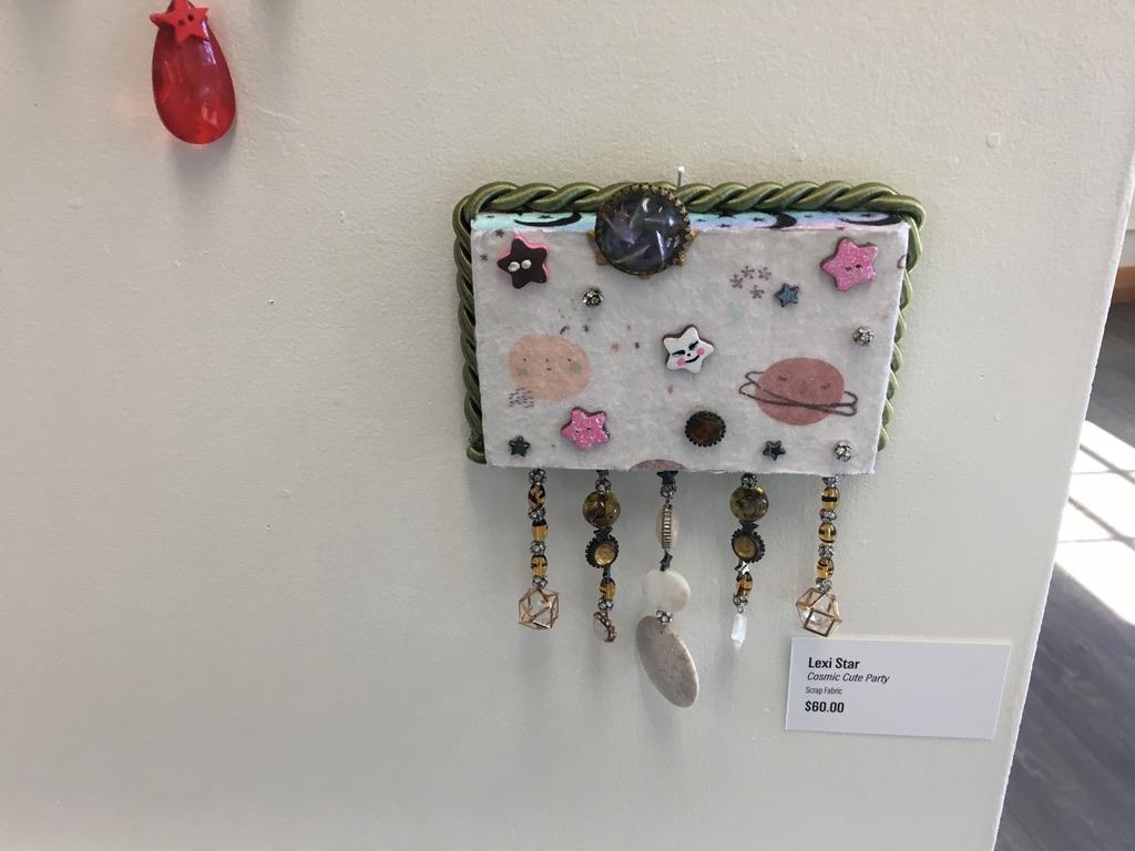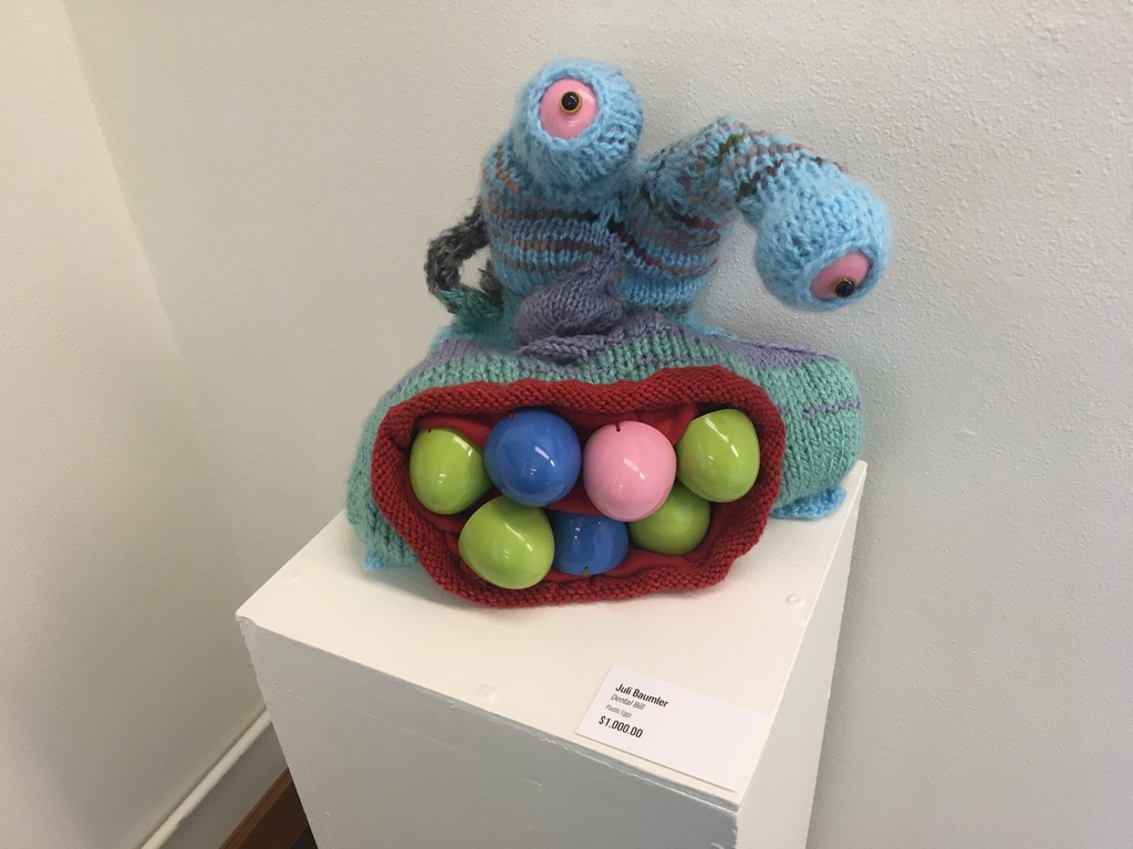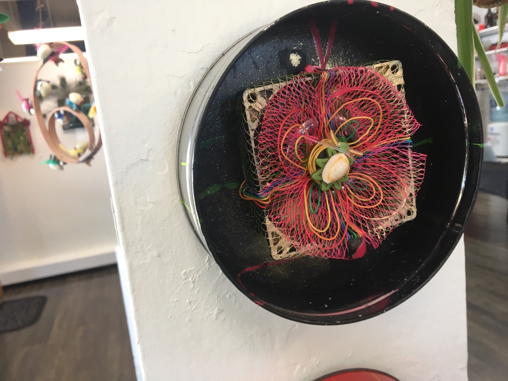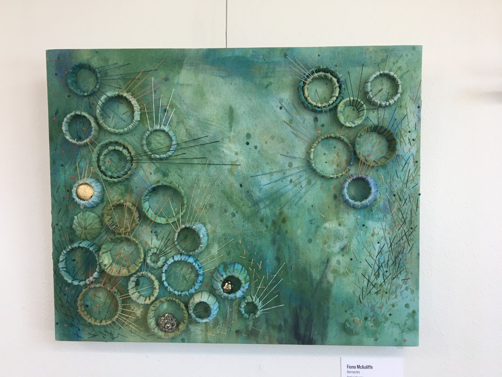 This gorgeous piece was so intricate, textured and layered, these barnacle like shapes are made from cut up plastic easter eggs covered by yarn and thread. artist is Fiona McAulife