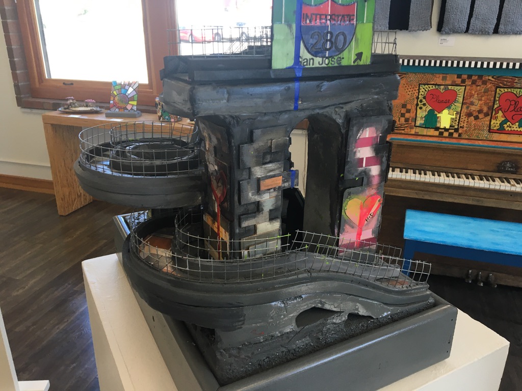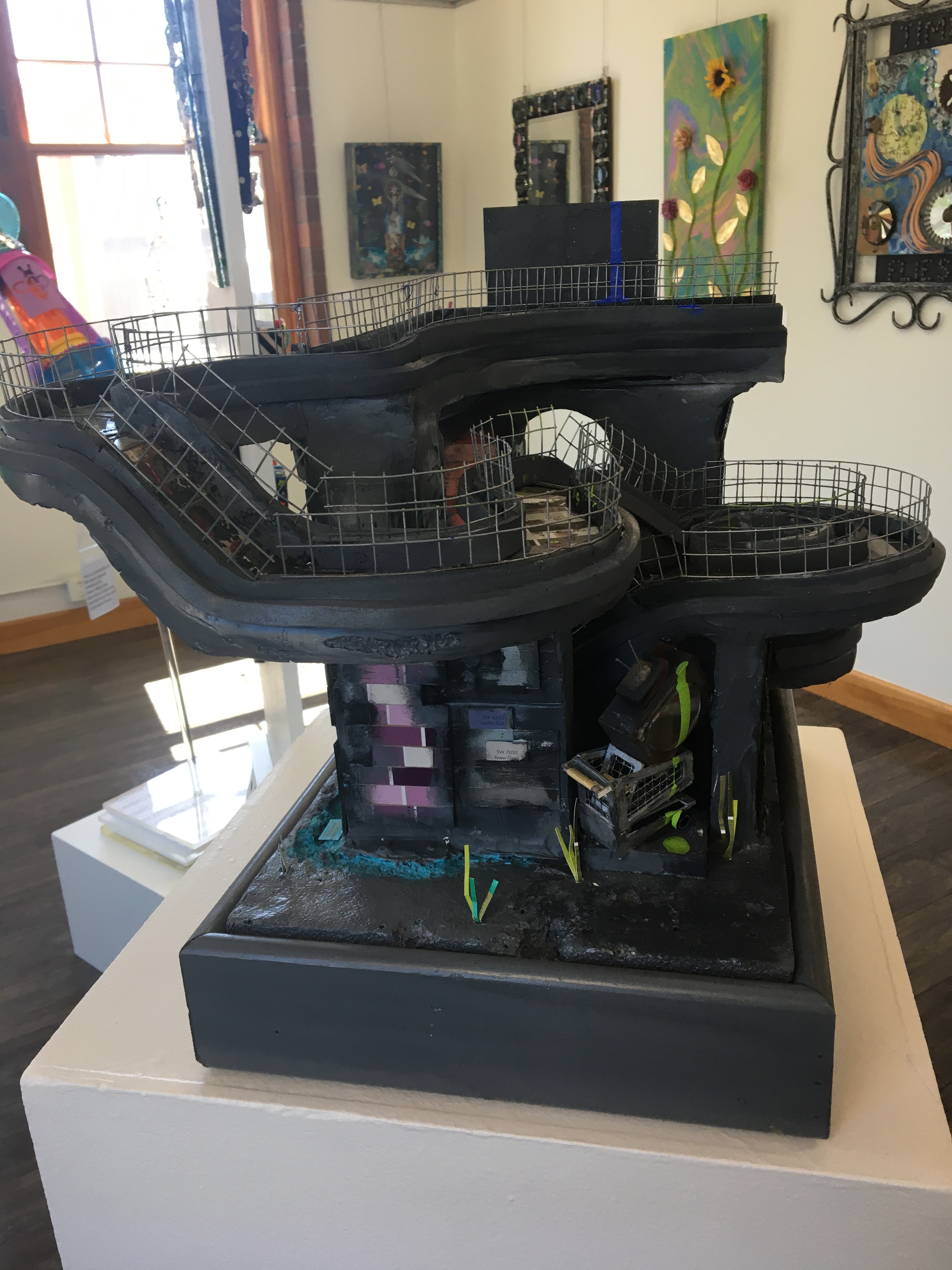 this piece reminded me of the phenomenon of homemade toys made from trash. It would be fun to run hot wheels cars down this sweet ramp, or play “warhammer 40,000” or “Necromunda” with this epic piece on the table.