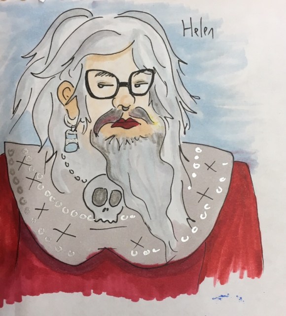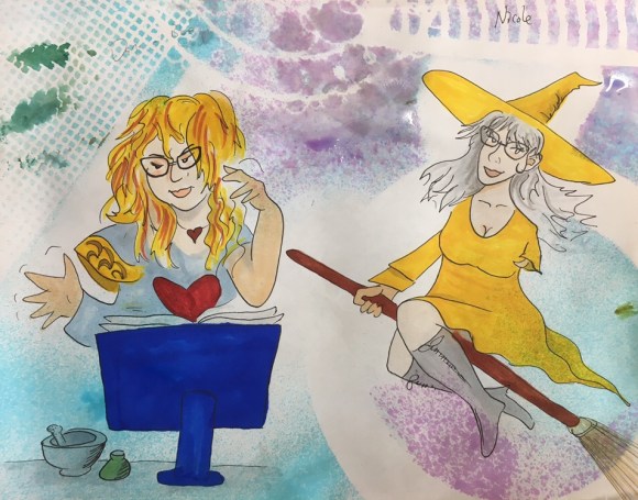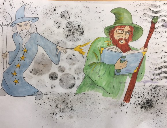 While some friends played a campaign, I made drawings. I asked them what color and kind of cloak or armor they wanted. I based the poses on some drawings I found in Dungeons and Dragons books and character images I found on the internet. The background is from my spray art style I’ve been playing with and using with my students lately.
