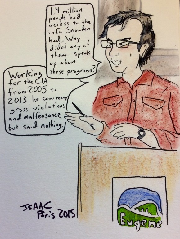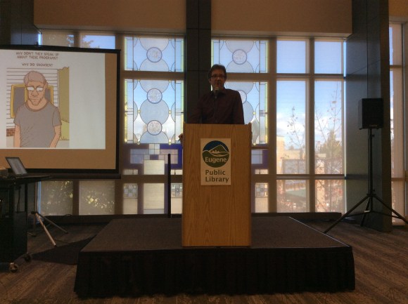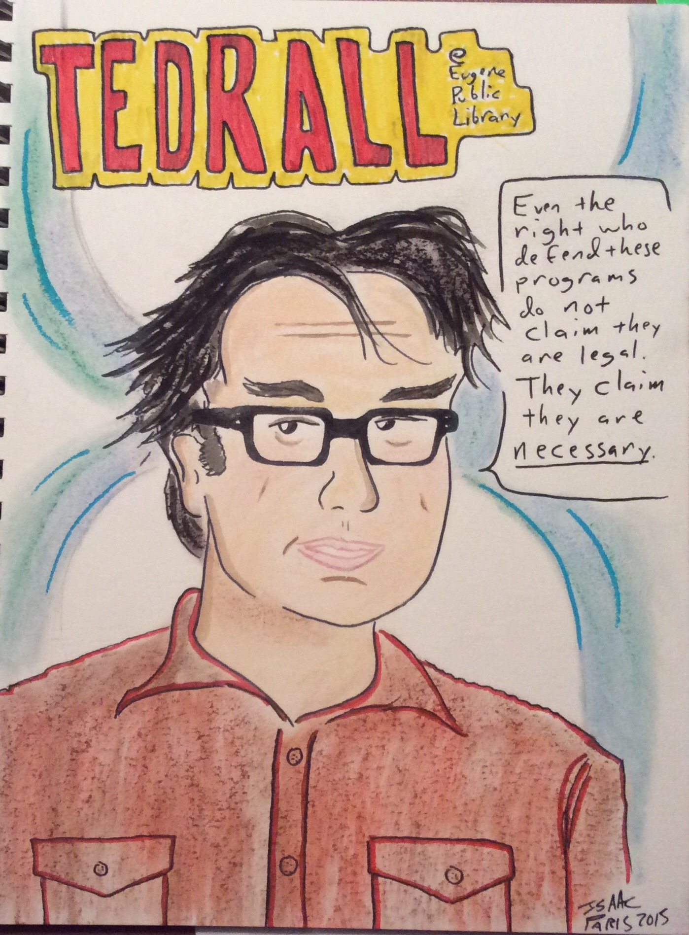 Political cartoonist, hero, despised liberal, journalist and funny guy Ted Rall visited the Eugene Public Library to tell us about his new book, “Snowden.” Here I drew him like he’s a superhero on the cover of a marvel comic book.