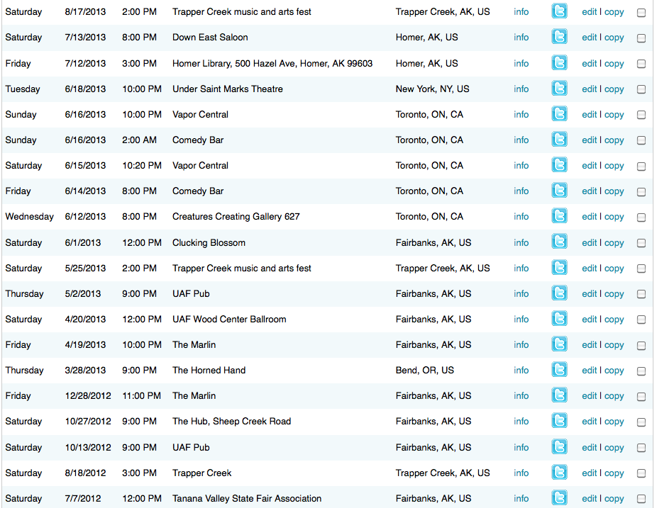 The Slaughter Daughters, Corrine Rose, The No Chance Charlies, The Phineas Gage, Spank Williams, Unicorn Justice (that’s not the name of the band), Dante Minalo, Terry Clement, Gregory Pepper, Liz Worth, Joey Comeau, Natalie Zina Walschots, Hal Niedzviecki, Steve Brown and the Bailers, Austin Steamers, Super Saturated Sugar Strings, Overby Family Band, Big Mama Lele and The Juicy Jugs, St. Animal, Jeffrey Lewis, Lorraine Leckie and Her Demons, The Stumblebum Brass Band, The Mountain Goats, Tim Fite, Matisyahu, Kill the Band, Saucy Yoda, Electric Tape, The Ba’cuntry Bruthers, Matt Hopper + The Roman Candles, Thought Trade, Whiskey Tango, The Scurvies, Tim Easton, The Sweeteners, The Goat Rodeo, Naked Men, Sabe Flores, Ukulele Russ, Jeff Kanzler, Robin Dale Ford and Pat Fitzgerald, The Stephanies, The Good Daze, Sweating Honey, Eating For Two, Green Tara, Fearless Pirates of Willygoat, Broom Box, The Muldoonies, Arctic Noise Symphony, Three Chord Ho!, Wayward Space Cadets, M Tentacles, The Moon Knights, Alex Olson, The New Centuries, Massive Moth, Blackout 101, Pretty Birds that Kill, Laila O’Sullivan, Rebecca Menzia, Mr. Mcfeely, 37SCDW, Methyl Red, Ezro Sun, The Stephanies, Savvy, Feeding Frenzy, Adam Bricks, Ramona Come Closer, La Cosa Nostra, Press Start to Rock, the Hickmans, Druqs, Miss Midnight Agogo, Tongue Brain Knee Thigh, The Jeffries and many others. He almost opened for The Lucky Dragons but his car broke down on the way!