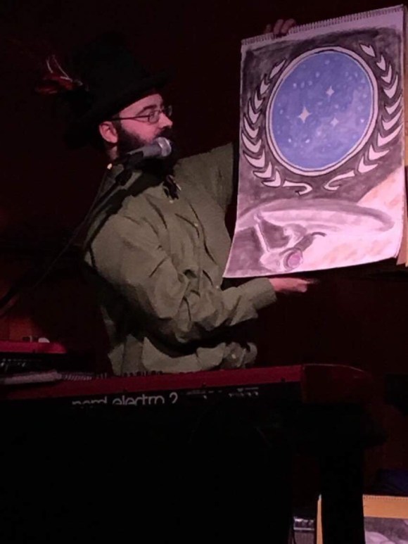 Performing the “Anthropic Principle Lullabye” at Clucking Blossom.