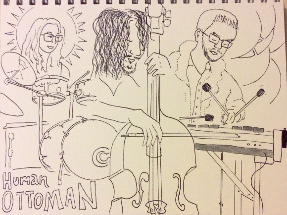 Human Ottoman play weird beautiful ethereal math rock. They call it polyrhythmic world metal. They say they are influenced by Brazilian rhythms, Fela Kuri, Mr. Bungle and they sing in Spanish and English. Susan loves Dave King from the Bad Plus. Matt loves folk music including Bob Dylan. They were all U of O music students.
