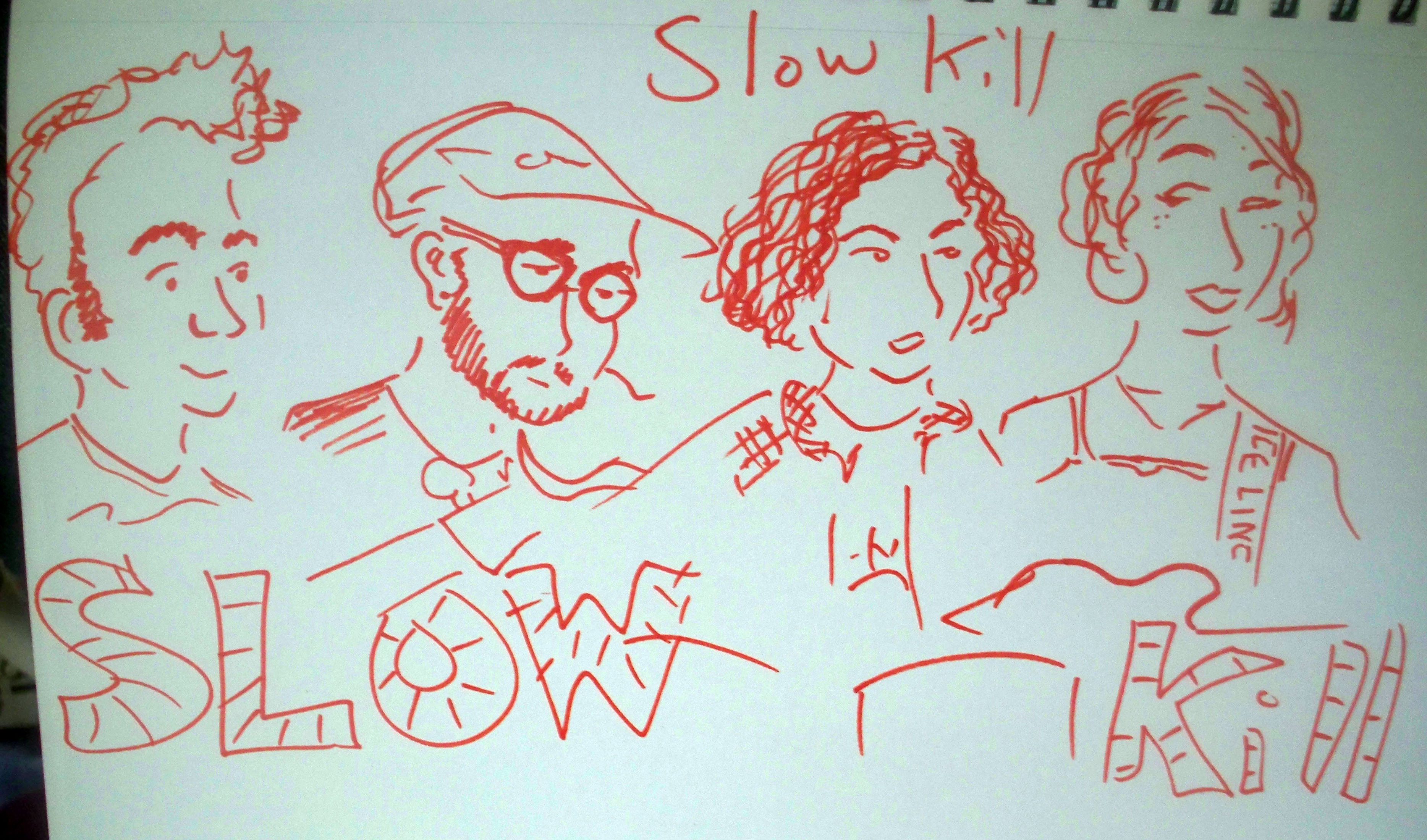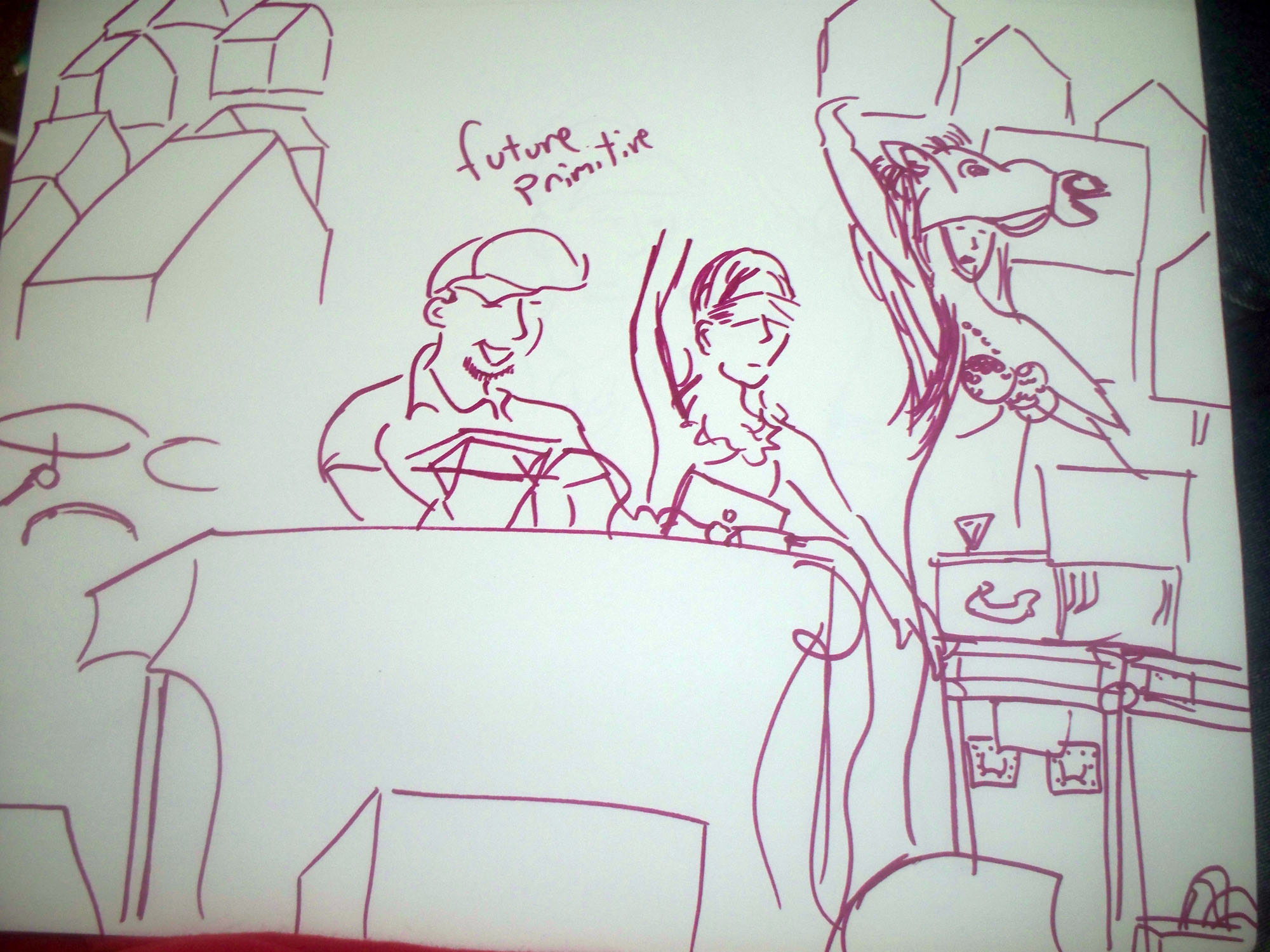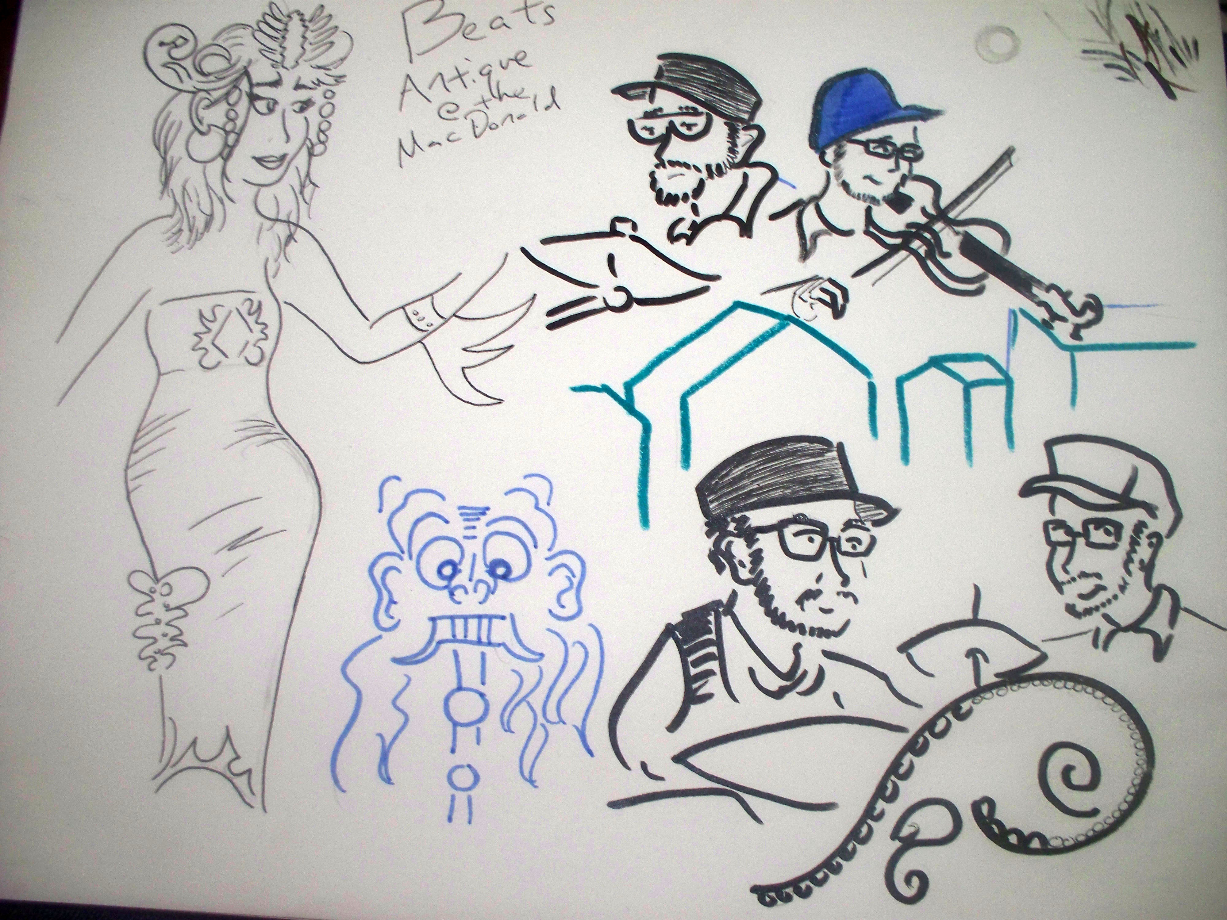 You can listen to their music at bandcamp. The geometric pyramid shapes that decorated their stage were a fun challenge to draw.