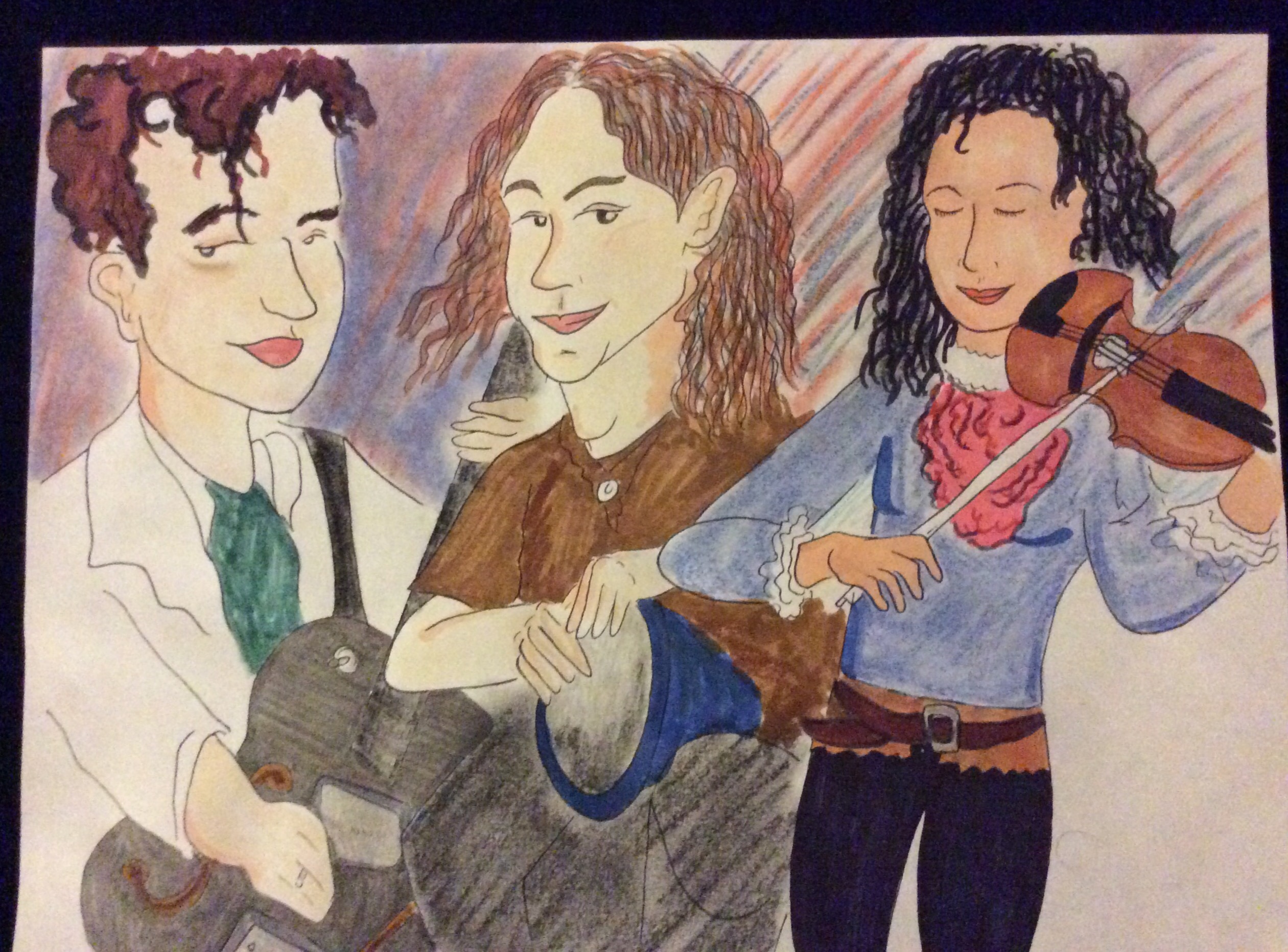 I took photos of the show and made drawings at home based on them. I was fun to add the lace effect in the background. Their music is on Spotify!