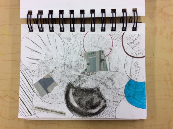 It utilizes patterns like a Zentangle, some elements of collage, some random chance (I threw a cup down on the page to trace and there was charcoal in the cup that marked the page.) I have been researching about Dadaism lately… This peice also uses the technique of blending/ drawing with an eraser. I used color sparingly. One ” rule ” of composition, is if you have a color appear somewhere on a piece, have the same color appear somewhere else. I intentionally broke that rule.
