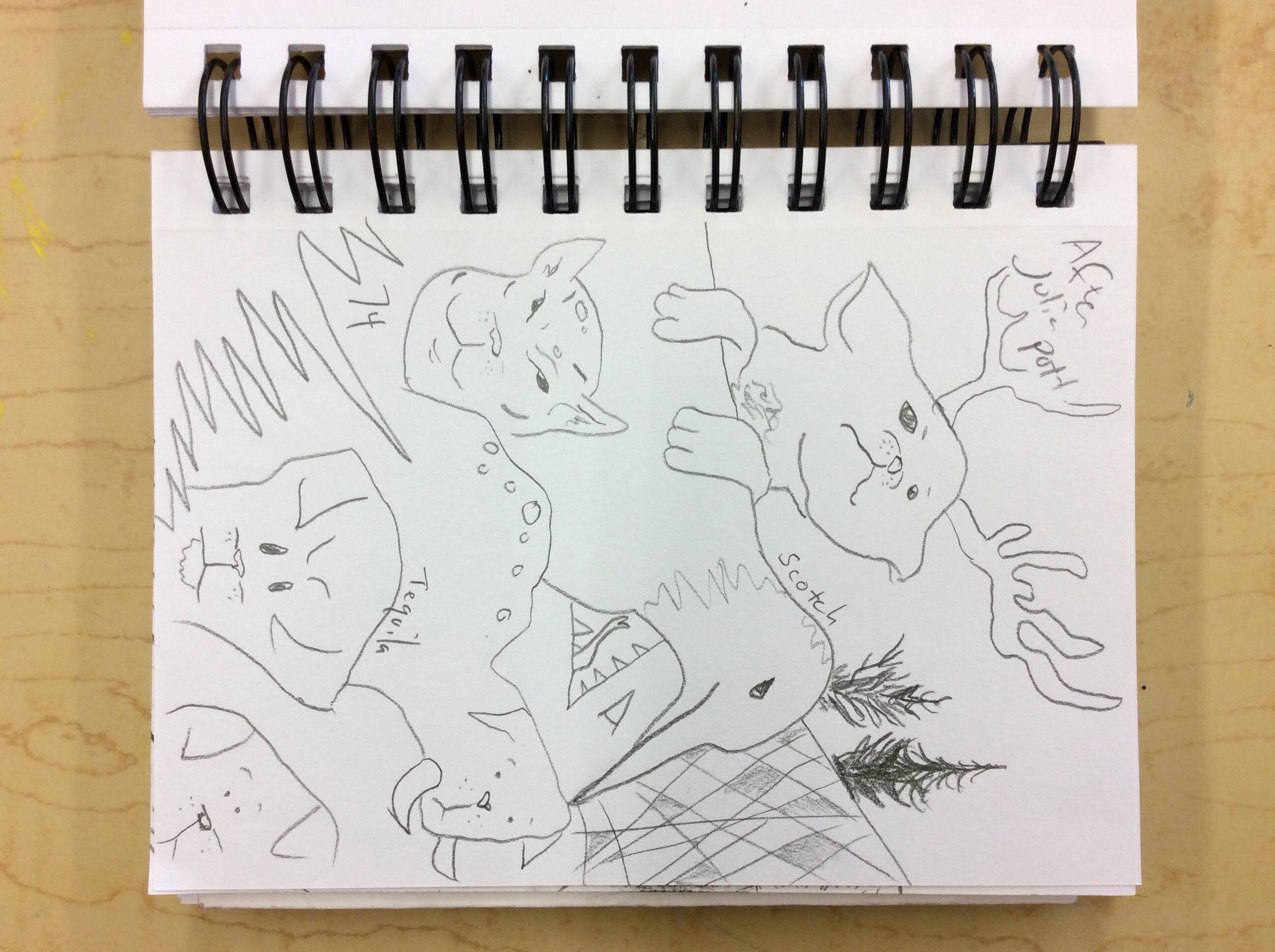 It features made up animals. Intentional distortions. I also included words that have nothing to do with the composition, forcing the viewers mind to make a connection that doesn’t seem to be there. By having one animal resting on the back of the other, I think it makes the animals that clearly don’t really exist, look a little more real, forcing the viewer to imagine perhaps the artist had a model he was looking at while drawing. It reminded me that as a child I would draw my own animals and dinosaurs, combining traits of many real animals into my own biologically feasible creations.