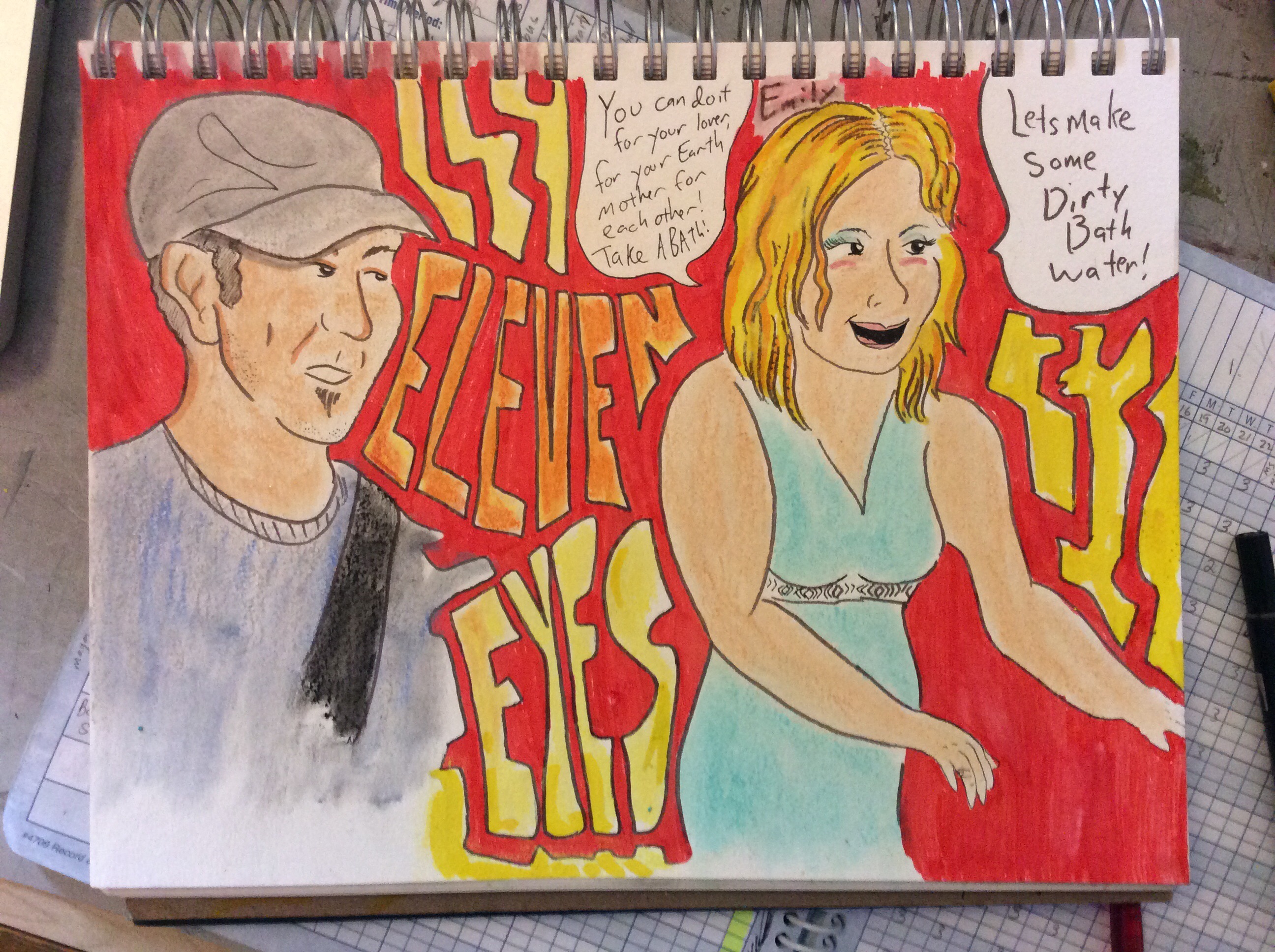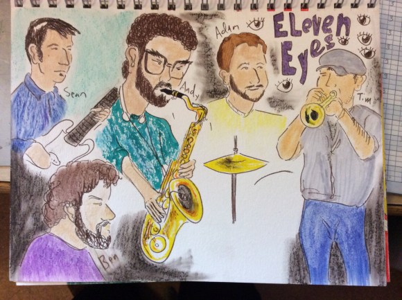 This fun band reminded me of Paper Scissors… their keyboard player played funky clavs, wurlitzer and B3 sounds… They played “National Anthem” from Radiohead. A very impressive cover of “Sail” by Awolnation. I think that is an excellent song that is not excellent when performed by the original artist. They also played some original funky reggae. Their singer was so beautiful. A joy to listen to and a delight to draw. Great band. Eleven Eyes. Their website is not up to date. there are photos of people not in the band, no photos of Emily, and it says there is a turntable player (there wasn’t tonight) but oh well, websites can be hard to keep up to date. Their music is fast, funky, horny and fun. Reminds me of Ulu and Brazilian Girls. They had a guest “Uncle Nancy.” Who I saw years ago play with his band “The Family Jewels” in Oakland.
