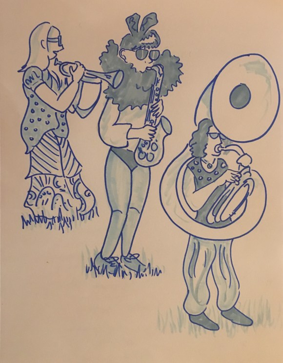 This band is totally fun and dresses in wacky costumes. They played for us on the grass in skinner’s butte park. Check them out here. I enjoyed their originals about elephants and bunnies and their cover of Radiohead’s “national anthem.” I feel I really got loose for these drawings and drew them in a Jules Fieffer and or William Blake kind of style. Shaded with copics.