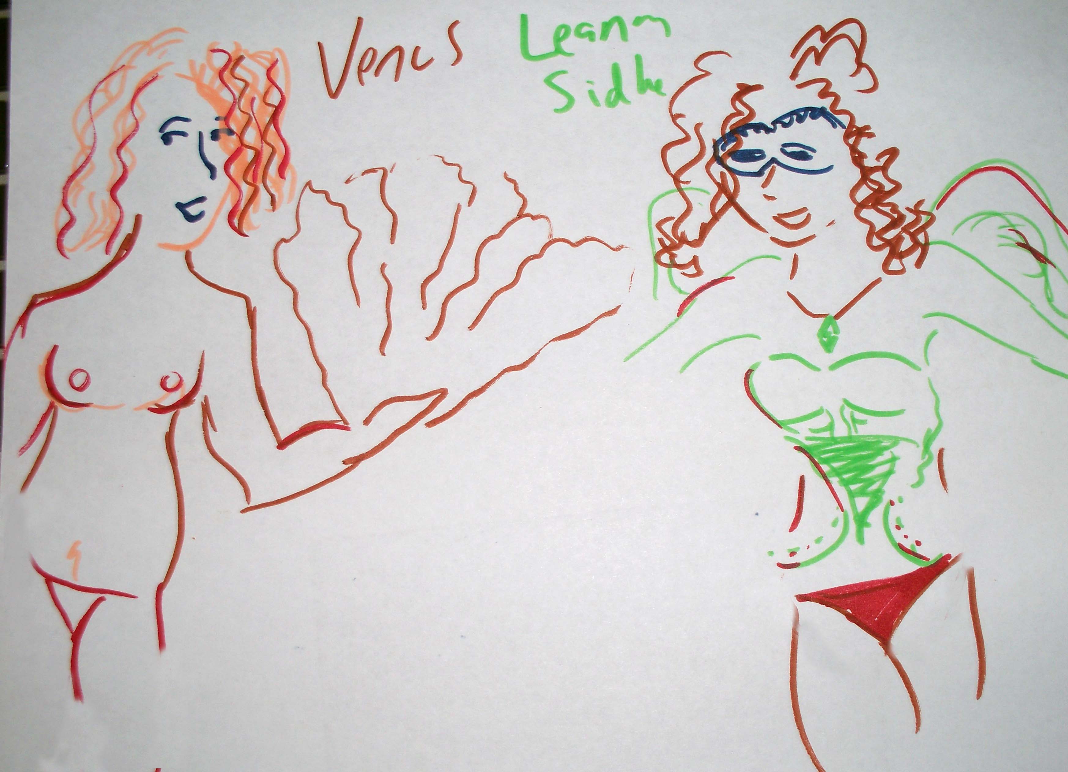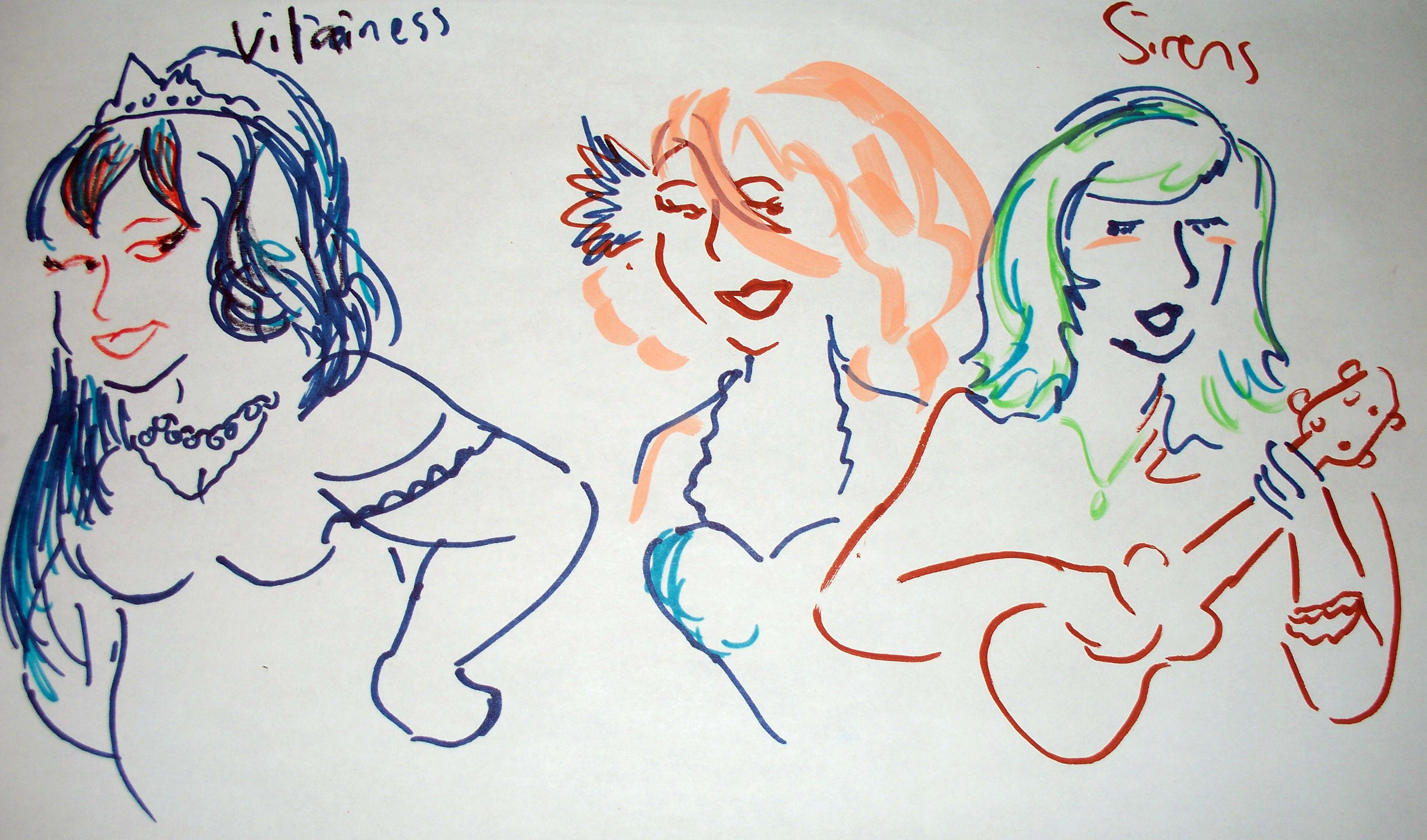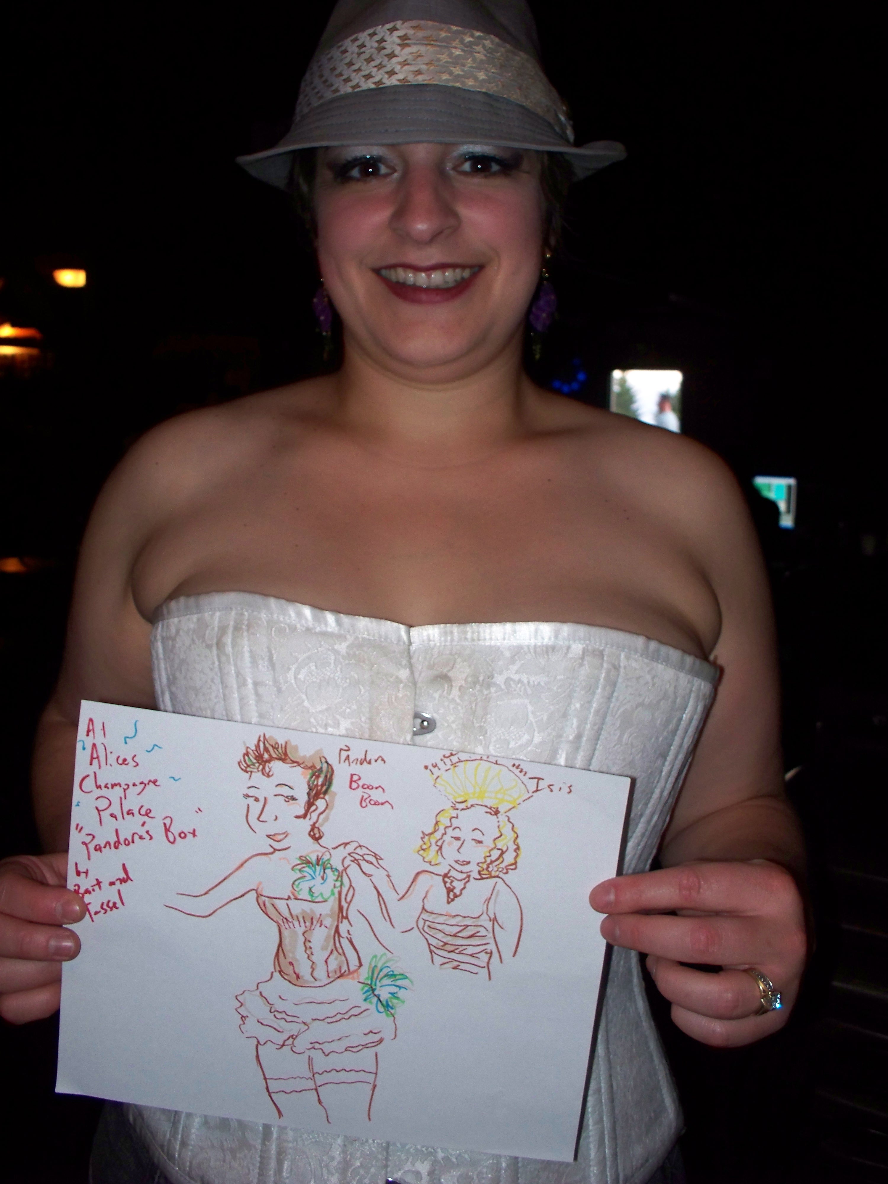 The costumes and dancing were fantastic. It was a good humored, fun show but contained little to no comedy. I like my burlesque to have a bit of sketch comedy, puns and innuendo but this was more “neo- burlesque.” I take that to mean- just dancing. There was some comedy in the elaborate costumes, including hairy goat legs for Pan, the only male dancer in the troupe- and Epona- who had a horse bottom attached to her back side and tramped around the stage. Here is Maple Sugar Mary after the show, holding my drawing of her as “Epona.”