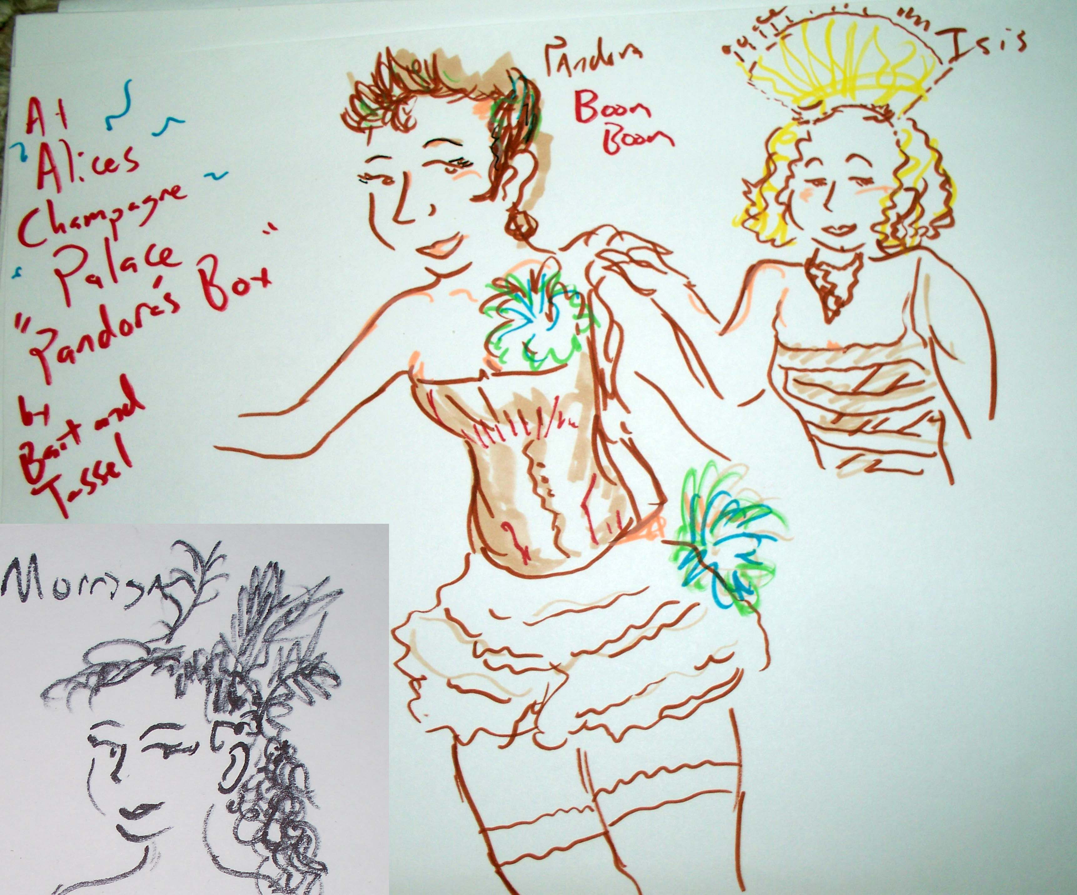 I went across the street to Alice’s Champagne Palace. I was told their burlesque show was sold out, but I got in anyhow. I made drawings of some of the dancers. It was difficult as they were all dancing and it was quite dark. I would have liked to have drawn them all but some danced for only two minutes and some danced in the dark (a hula hooper with LED lights on her hula hoop.