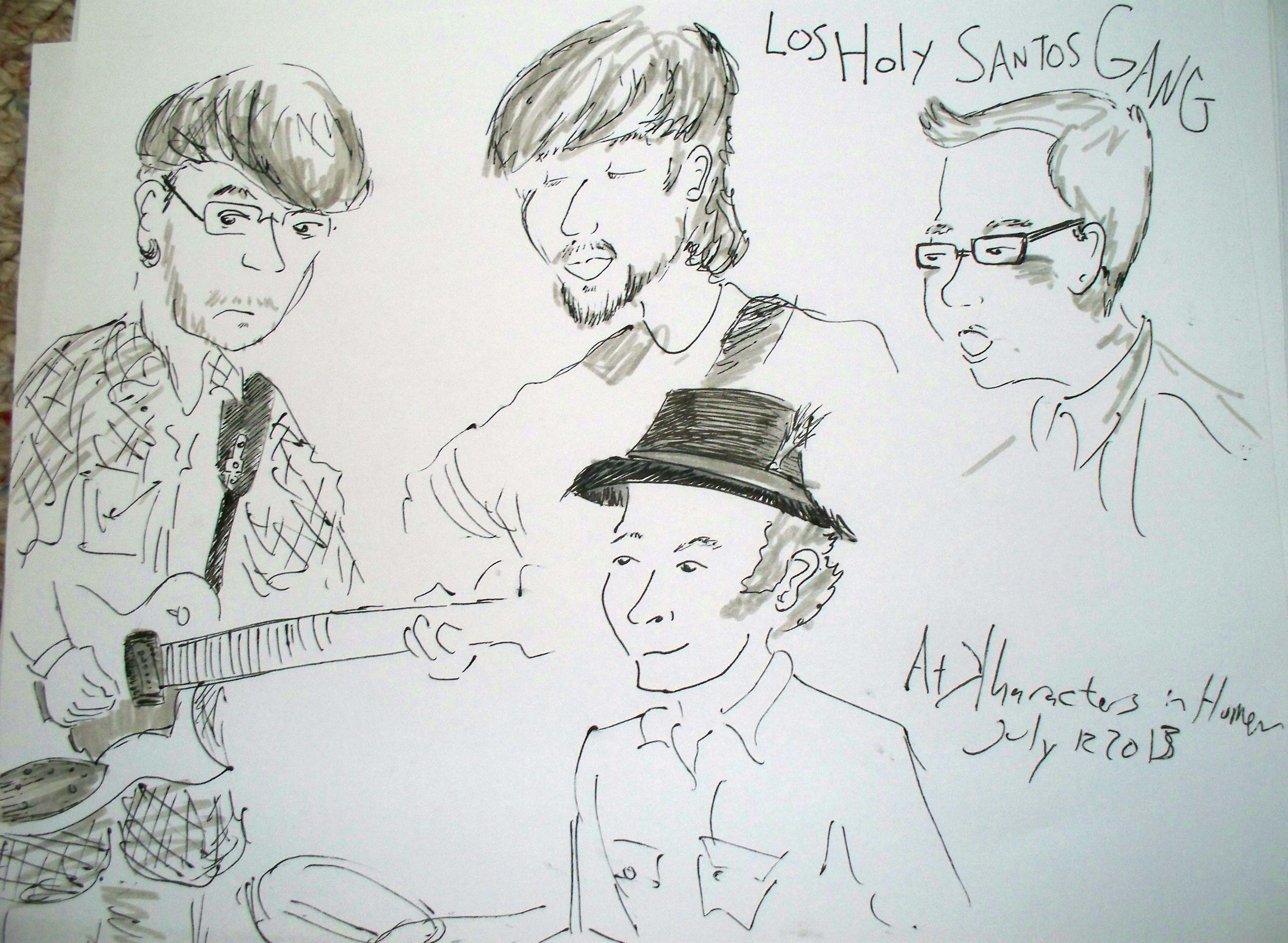 I have enjoyed some entertainment in Homer. After a successful comics workshop at the lovely Homer library, I went out for a night on the town and caught two shows. I made drawings of both. The Holy Santos Gang played at Kharacters. Solid rock/ country band with good musicianship.