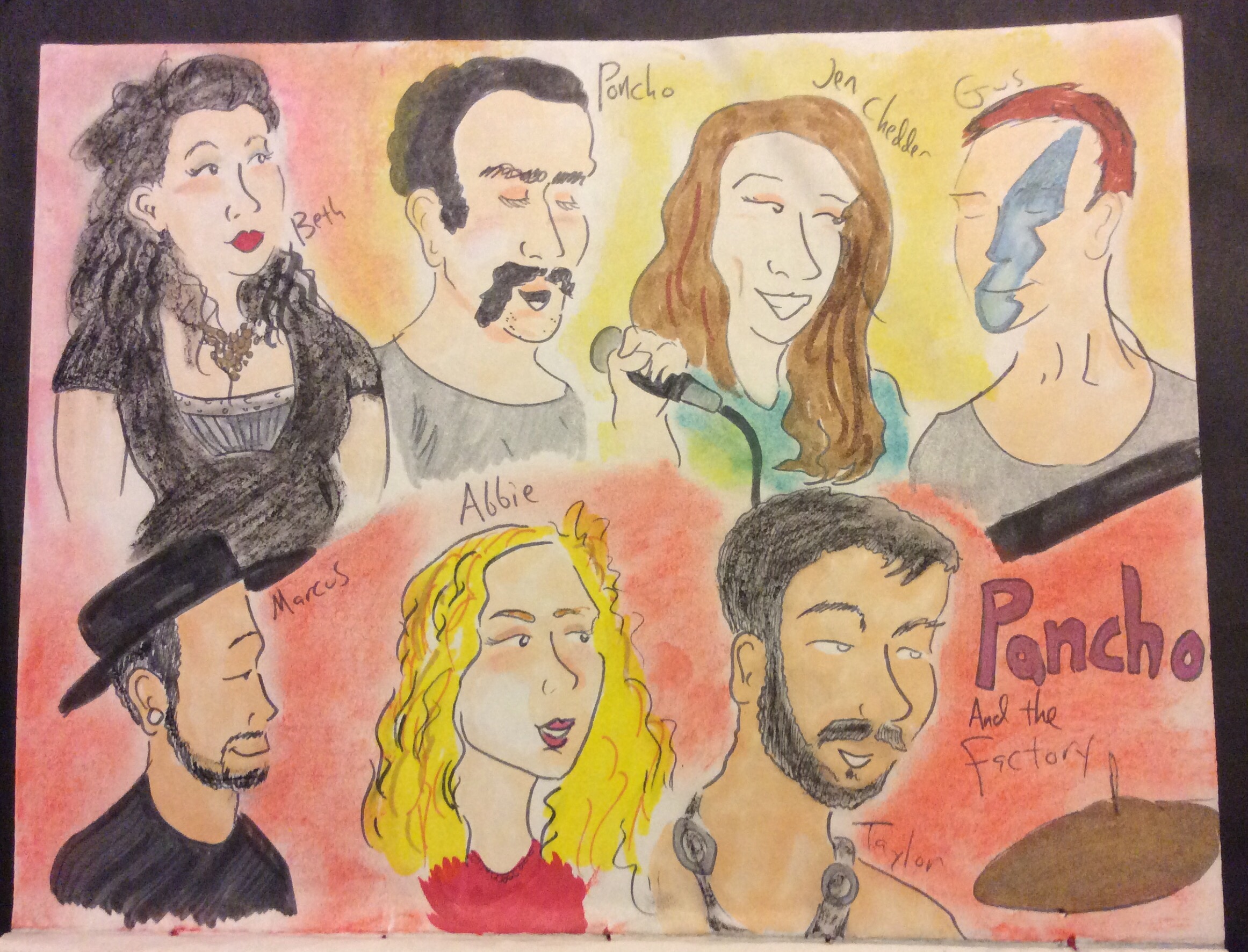 Pancho + the Factory were a super enthusiastic party band! Four vocalists! Needs keyboards though. I drew this in pen and I wasn’t happy with the drawing of Jen so I drew her over again. Abbie said, “aw, look how pretty I am!” They dressed up in wild costumes and put on a real fun show. There was a fifties Elvis/rockabilly style to Pancho’s vocals, and a disco vibe to their costumes. Everybody oozed sexuality and the music was pleasantly minimalist, room to breathe. I dug it.