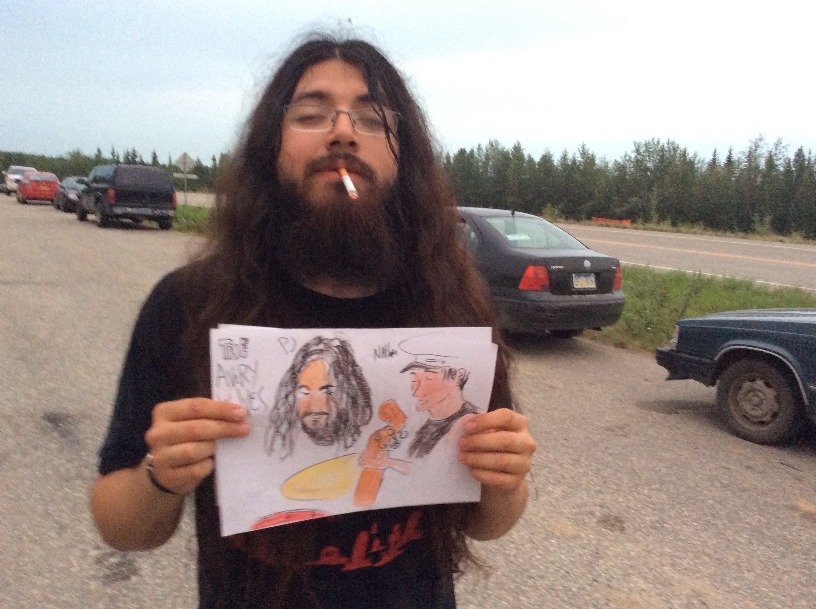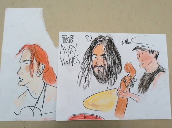 Moselle does the art for her band, I think its neat that a single person does all the art for the merch, cd covers and t shirts, that way there is a single vision and oeuvre. She puts waves and dripping water in the art, so I put some in my drawing. She also did animation for the music video, “to sing true of love.” She told me part of touring which is just as important as sharing music with fans is seeing the beauty of the natural world in our National State Parks. She listed her favorite as the Anhinga trail in the florida Everglades because it was so full of wildlife. “Like a zoo, but the animals are free and in their habitat.” Another thing I like to ask touring bands is, “what do you eat on tour?”Moselle- “We like to cook rice and a vegetable, a one pot cowboy meal. We try to eat out as little as possible. We eat souerkraut, mac and cheese with Kale, one treat we really like is canned trout from Trader Joes, on a stone wheat cracker with onions.