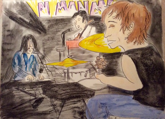 this drawing is very different than most of my drawings, it was made at the corner of the stage. I was right behind the drummer and this was my perspective of the show- semi to scale and in proper perspective.