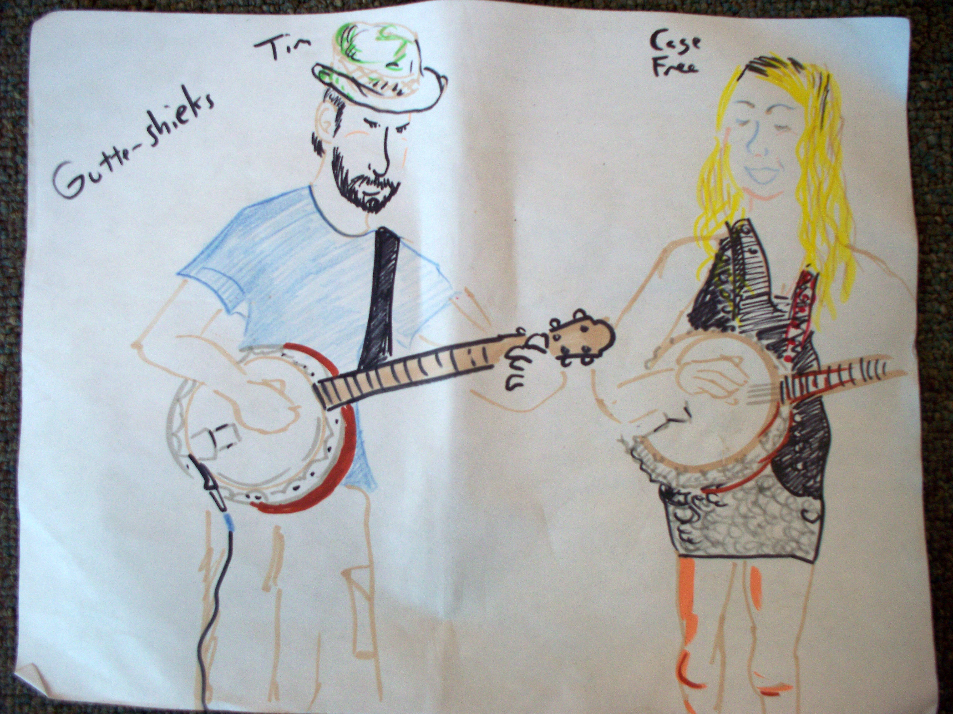The Stumblebums played again, ( their third time here) and I didn’t bother to draw as It was so late and so dark. They played a new free jazzesque song in tribute to a dog who has passed away. All the lyrics were ” woof woof,” but delivered in a wide variety of inflections.”