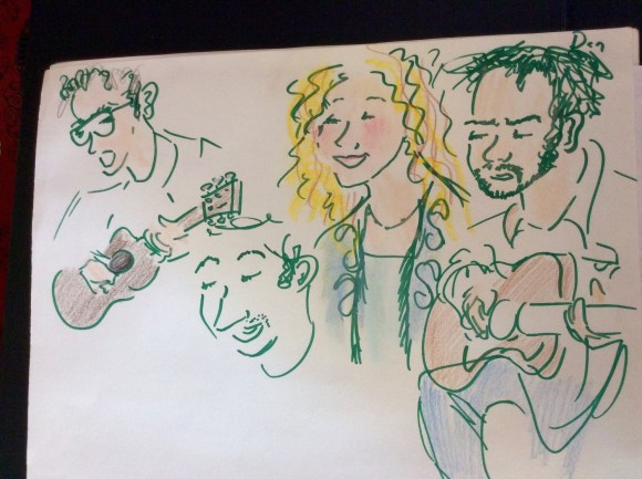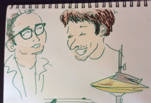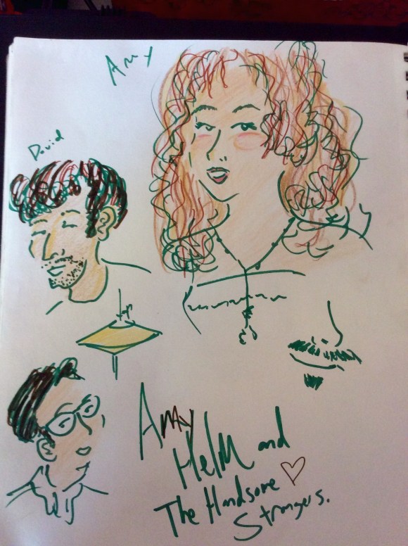 Fancy shmancy swingin sleaze, delivered with so much charm and swagger. The horn section was so tight. the dance moves, hat juggling tricks and stage banter was all so much fun. I listened to these guys back when I was 19. I think they have new members now. They had a young Japanese guitarist. A fan told me that their bass player had been there from the beginning. I didn’t have my art stuff with me, so I just sketched them in pencil on some flyers that were on a table. Their fans are loyal. They were fantastic.